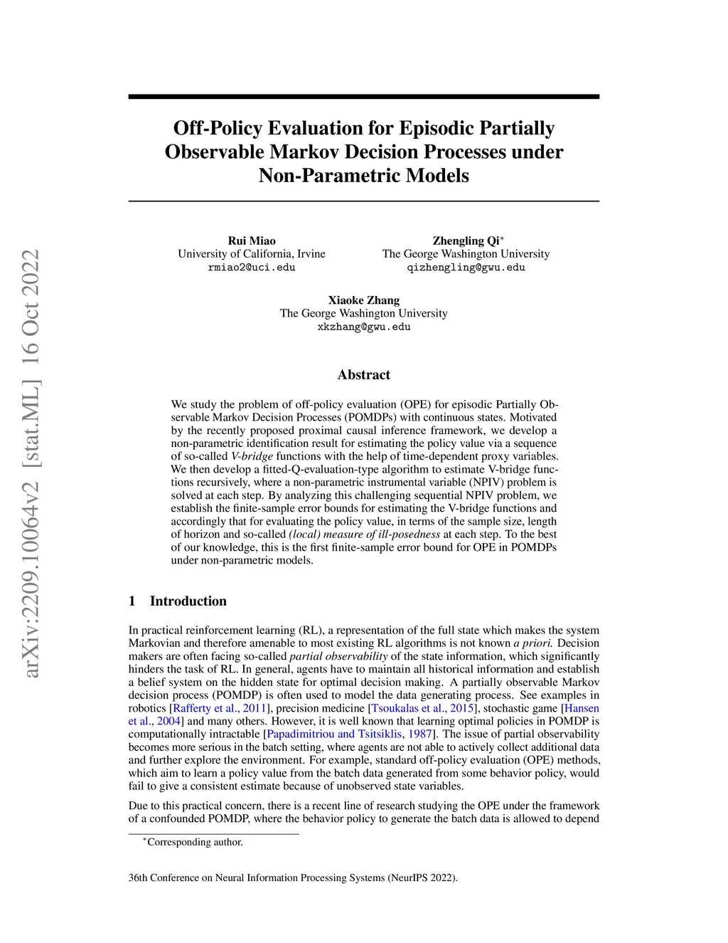 We study the problem of off-policy evaluation (OPE) for episodic Partially Observable Markov Decision Processes (POMDPs) with continuous states. Motivated by the recently proposed proximal causal inference framework, we develop a non-parametric identification result for estimating the policy value via a sequence of so-called V-bridge functions with the help of time-dependent proxy variables. We then develop a fitted-Q-evaluation-type algorithm to estimate V-bridge functions recursively, where a non-parametric instrumental variable (NPIV) problem is solved at each step. By analyzing this challenging sequential NPIV problem, we establish the finite-sample error bounds for estimating the V-bridge functions and accordingly that for evaluating the policy value, in terms of the sample size, length of horizon and so-called (local) measure of ill-posedness at each step. To the best of our knowledge, this is the first finite-sample error bound for OPE in POMDPs under non-parametric models.