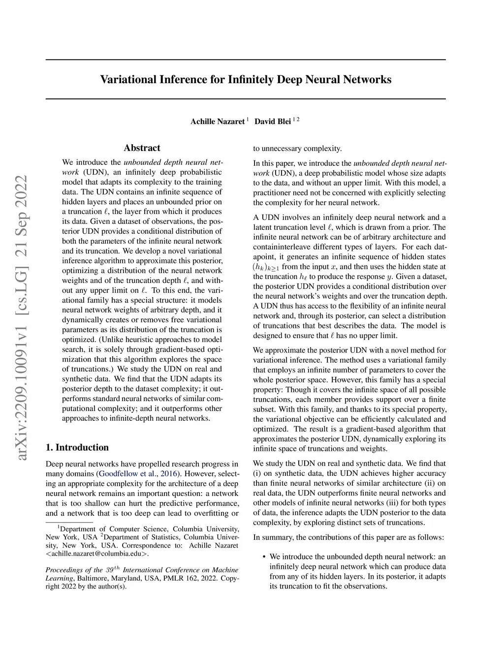 We introduce the unbounded depth neural network (UDN), an infinitely deep probabilistic model that adapts its complexity to the training data. The UDN contains an infinite sequence of hidden layers and places an unbounded prior on a truncation L, the layer from which it produces its data. Given a dataset of observations, the posterior UDN provides a conditional distribution of both the parameters of the infinite neural network and its truncation. We develop a novel variational inference algorithm to approximate this posterior, optimizing a distribution of the neural network weights and of the truncation depth L, and without any upper limit on L. To this end, the variational family has a special structure: it models neural network weights of arbitrary depth, and it dynamically creates or removes free variational parameters as its distribution of the truncation is optimized. (Unlike heuristic approaches to model search, it is solely through gradient-based optimization that this algorithm explores the space of truncations.) We study the UDN on real and synthetic data. We find that the UDN adapts its posterior depth to the dataset complexity; it outperforms standard neural networks of similar computational complexity; and it outperforms other approaches to infinite-depth neural networks.