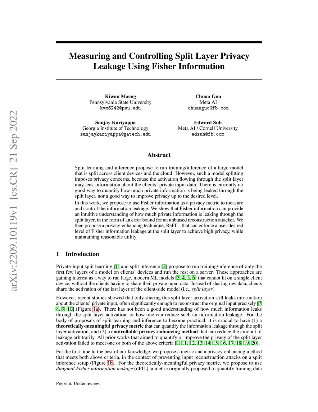 Split learning and inference propose to run training/inference of a large model that is split across client devices and the cloud. However, such a model splitting imposes privacy concerns, because the activation flowing through the split layer may leak information about the clients' private input data. There is currently no good way to quantify how much private information is being leaked through the split layer, nor a good way to improve privacy up to the desired level. In this work, we propose to use Fisher information as a privacy metric to measure and control the information leakage. We show that Fisher information can provide an intuitive understanding of how much private information is leaking through the split layer, in the form of an error bound for an unbiased reconstruction attacker. We then propose a privacy-enhancing technique, ReFIL, that can enforce a user-desired level of Fisher information leakage at the split layer to achieve high privacy, while maintaining reasonable utility.
