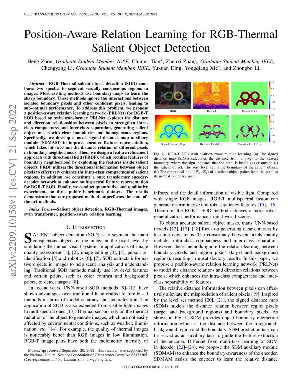 RGB-Thermal salient object detection (SOD) combines two spectra to segment visually conspicuous regions in images. Most existing methods use boundary maps to learn the sharp boundary. These methods ignore the interactions between isolated boundary pixels and other confident pixels, leading to sub-optimal performance. To address this problem,we propose a position-aware relation learning network (PRLNet) for RGB-T SOD based on swin transformer. PRLNet explores the distance and direction relationships between pixels to strengthen intra-class compactness and inter-class separation, generating salient object masks with clear boundaries and homogeneous regions. Specifically, we develop a novel signed distance map auxiliary module (SDMAM) to improve encoder feature representation, which takes into account the distance relation of different pixels in boundary neighborhoods. Then, we design a feature refinement approach with directional field (FRDF), which rectifies features of boundary neighborhood by exploiting the features inside salient objects. FRDF utilizes the directional information between object pixels to effectively enhance the intra-class compactness of salient regions. In addition, we constitute a pure transformer encoder-decoder network to enhance multispectral feature representation for RGB-T SOD. Finally, we conduct quantitative and qualitative experiments on three public benchmark datasets.The results demonstrate that our proposed method outperforms the state-of-the-art methods.