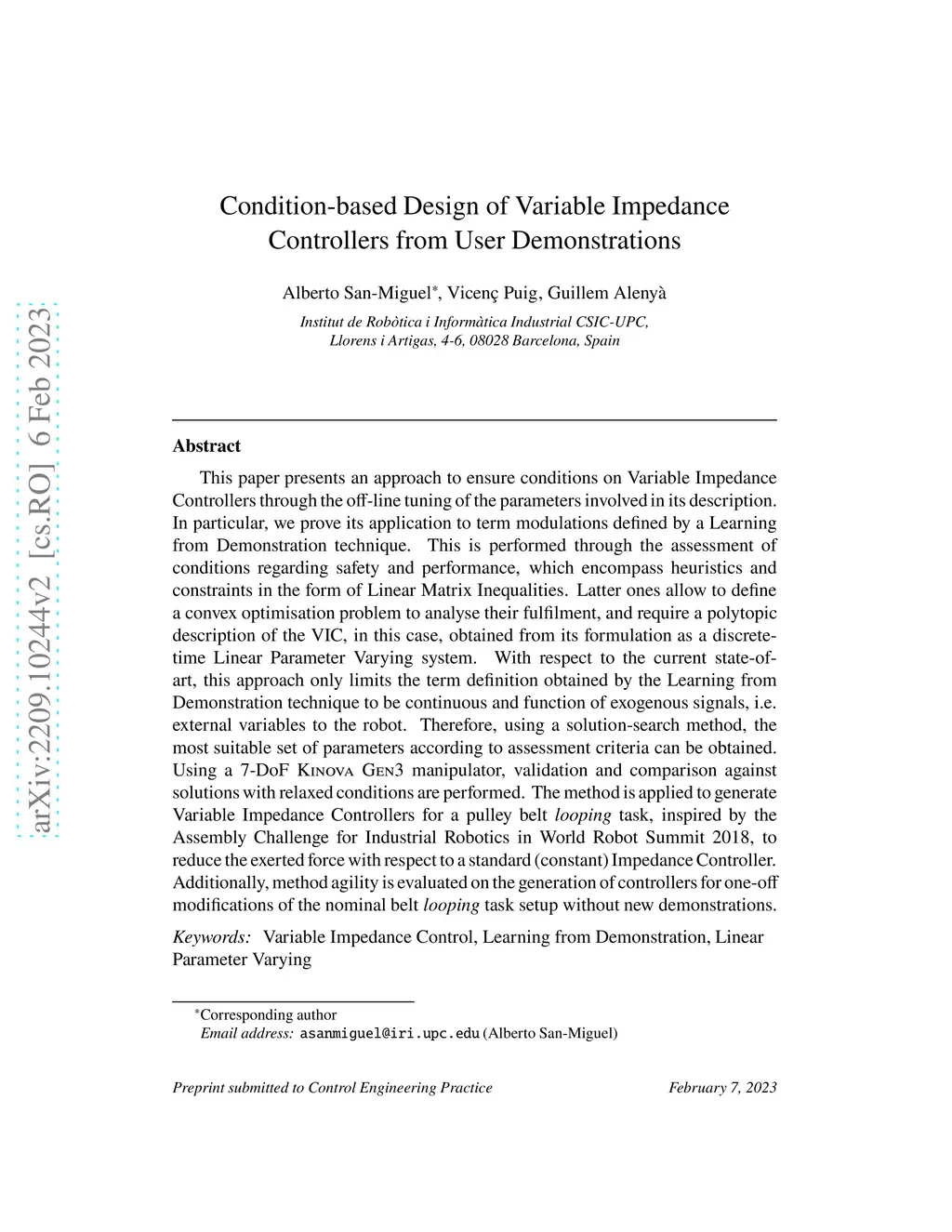 This paper presents an approach to ensure conditions on Variable Impedance Controllers through the off-line tuning of the parameters involved in its description. In particular, we prove its application to term modulations defined by a Learning from Demonstration technique. This is performed through the assessment of conditions regarding safety and performance, which encompass heuristics and constraints in the form of Linear Matrix Inequalities. Latter ones allow to define a convex optimisation problem to analyse their fulfilment, and require a polytopic description of the VIC, in this case, obtained from its formulation as a discrete-time Linear Parameter Varying system. With respect to the current state-of-art, this approach only limits the term definition obtained by the Learning from Demonstration technique to be continuous and function of exogenous signals, i.e. external variables to the robot. Therefore, using a solution-search method, the most suitable set of parameters according to assessment criteria can be obtained. Using a 7-DoF Kinova Gen3 manipulator, validation and comparison against solutions with relaxed conditions are performed. The method is applied to generate Variable Impedance Controllers for a pulley belt looping task, inspired by the Assembly Challenge for Industrial Robotics in World Robot Summit 2018, to reduce the exerted force with respect to a standard (constant) Impedance Controller. Additionally, method agility is evaluated on the generation of controllers for one-off modifications of the nominal belt looping task setup without new demonstrations.