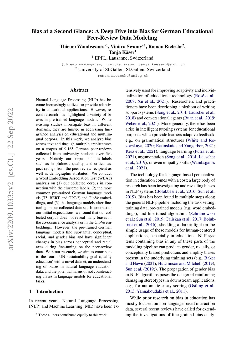 Natural Language Processing (NLP) has become increasingly utilized to provide adaptivity in educational applications. However, recent research has highlighted a variety of biases in pre-trained language models. While existing studies investigate bias in different domains, they are limited in addressing fine-grained analysis on educational and multilingual corpora. In this work, we analyze bias across text and through multiple architectures on a corpus of 9,165 German peer-reviews collected from university students over five years. Notably, our corpus includes labels such as helpfulness, quality, and critical aspect ratings from the peer-review recipient as well as demographic attributes. We conduct a Word Embedding Association Test (WEAT) analysis on (1) our collected corpus in connection with the clustered labels, (2) the most common pre-trained German language models (T5, BERT, and GPT-2) and GloVe embeddings, and (3) the language models after fine-tuning on our collected data-set. In contrast to our initial expectations, we found that our collected corpus does not reveal many biases in the co-occurrence analysis or in the GloVe embeddings. However, the pre-trained German language models find substantial conceptual, racial, and gender bias and have significant changes in bias across conceptual and racial axes during fine-tuning on the peer-review data. With our research, we aim to contribute to the fourth UN sustainability goal (quality education) with a novel dataset, an understanding of biases in natural language education data, and the potential harms of not counteracting biases in language models for educational tasks.