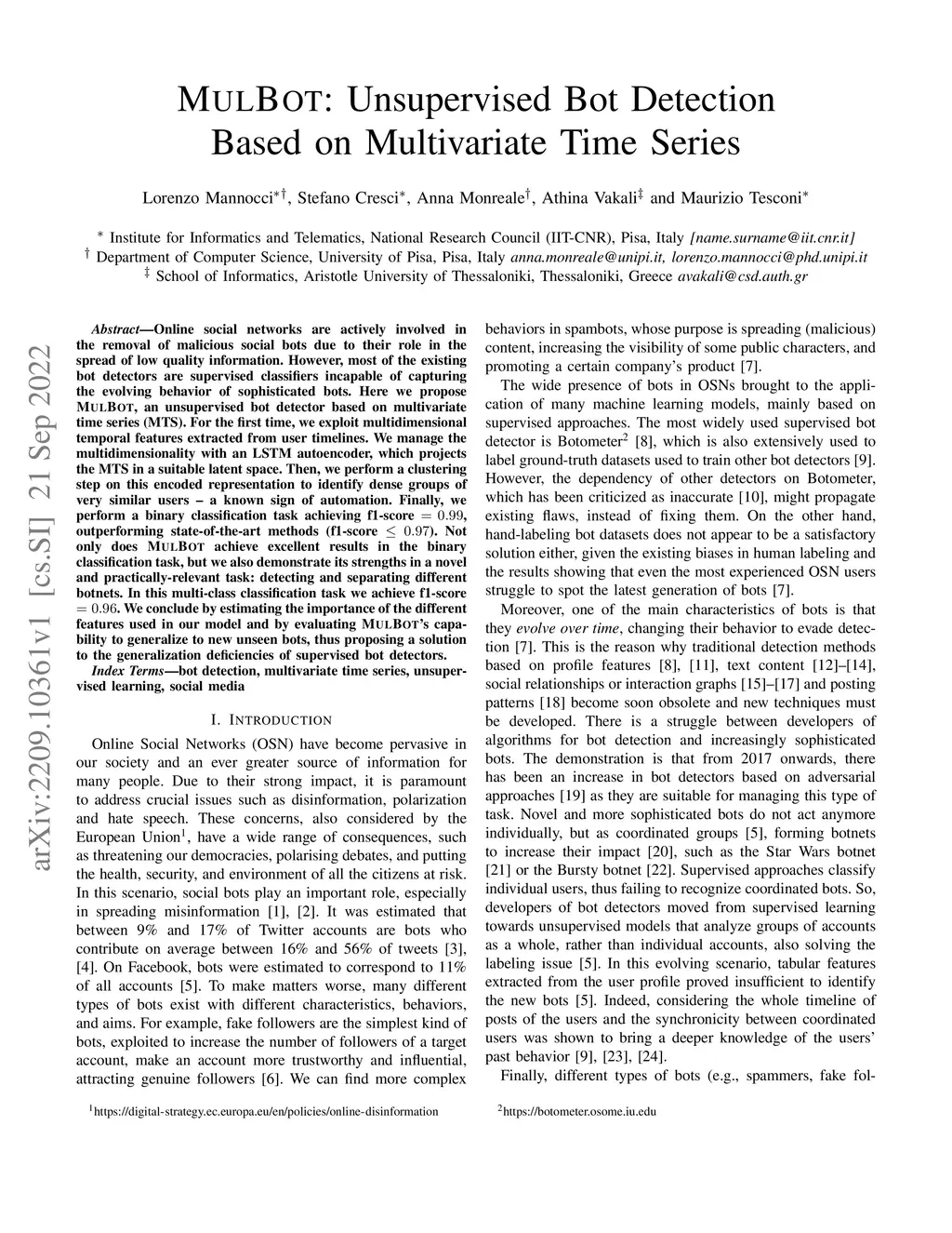 Online social networks are actively involved in the removal of malicious social bots due to their role in the spread of low quality information. However, most of the existing bot detectors are supervised classifiers incapable of capturing the evolving behavior of sophisticated bots. Here we propose MulBot, an unsupervised bot detector based on multivariate time series (MTS). For the first time, we exploit multidimensional temporal features extracted from user timelines. We manage the multidimensionality with an LSTM autoencoder, which projects the MTS in a suitable latent space. Then, we perform a clustering step on this encoded representation to identify dense groups of very similar users -- a known sign of automation. Finally, we perform a binary classification task achieving f1-score , outperforming state-of-the-art methods (f1-score ). Not only does MulBot achieve excellent results in the binary classification task, but we also demonstrate its strengths in a novel and practically-relevant task: detecting and separating different botnets. In this multi-class classification task we achieve f1-score . We conclude by estimating the importance of the different features used in our model and by evaluating MulBot's capability to generalize to new unseen bots, thus proposing a solution to the generalization deficiencies of supervised bot detectors.