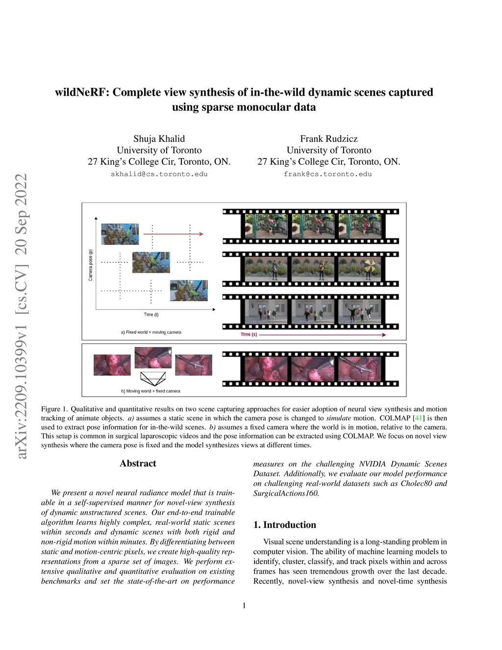 We present a novel neural radiance model that is trainable in a self-supervised manner for novel-view synthesis of dynamic unstructured scenes. Our end-to-end trainable algorithm learns highly complex, real-world static scenes within seconds and dynamic scenes with both rigid and non-rigid motion within minutes. By differentiating between static and motion-centric pixels, we create high-quality representations from a sparse set of images. We perform extensive qualitative and quantitative evaluation on existing benchmarks and set the state-of-the-art on performance measures on the challenging NVIDIA Dynamic Scenes Dataset. Additionally, we evaluate our model performance on challenging real-world datasets such as Cholec80 and SurgicalActions160.