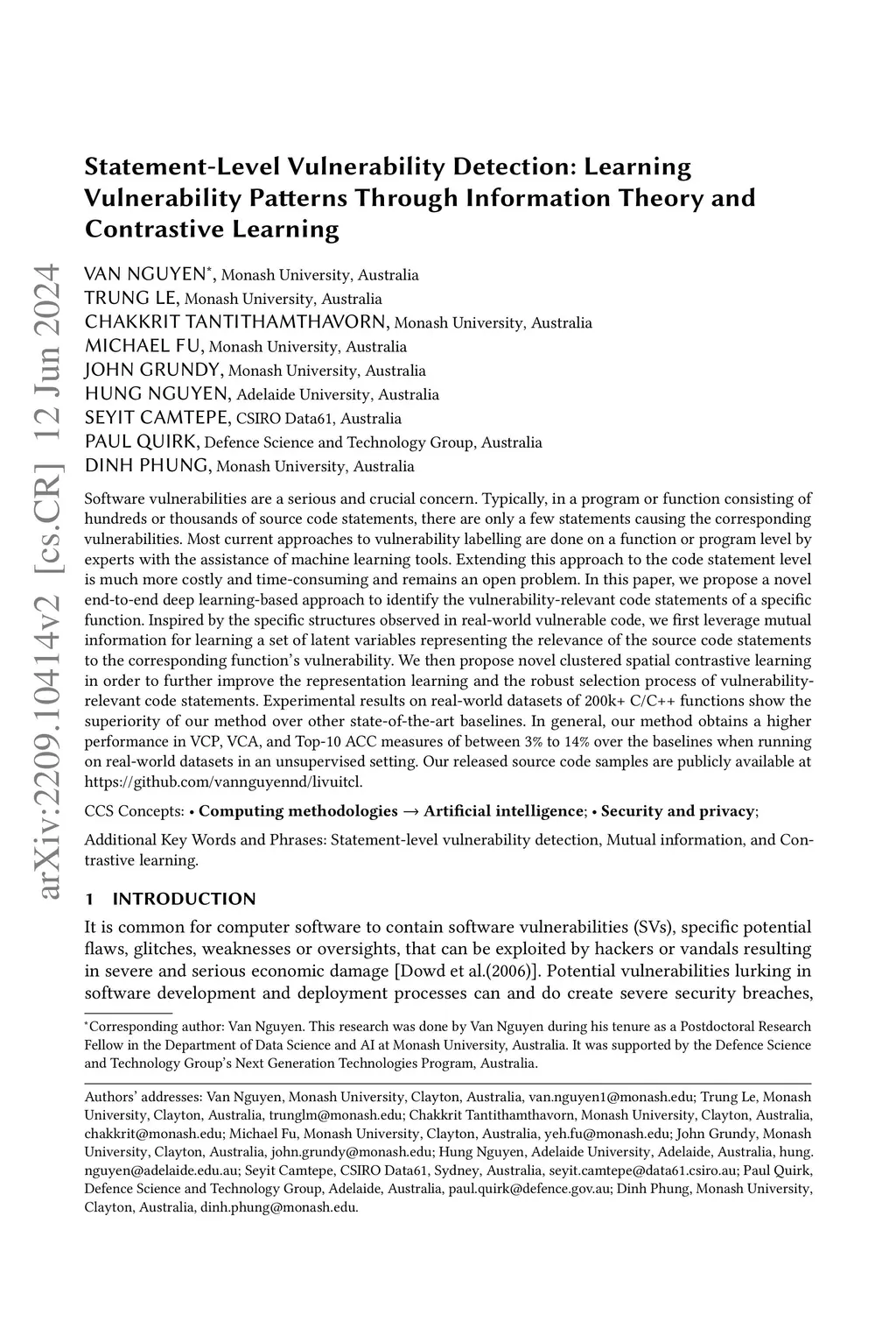 Software vulnerabilities are a serious and crucial concern. Typically, in a program or function consisting of hundreds or thousands of source code statements, there are only a few statements causing the corresponding vulnerabilities. Most current approaches to vulnerability labelling are done on a function or program level by experts with the assistance of machine learning tools. Extending this approach to the code statement level is much more costly and time-consuming and remains an open problem. In this paper, we propose a novel end-to-end deep learning-based approach to identify the vulnerability-relevant code statements of a specific function. Inspired by the specific structures observed in real-world vulnerable code, we first leverage mutual information for learning a set of latent variables representing the relevance of the source code statements to the corresponding function's vulnerability. We then propose novel clustered spatial contrastive learning in order to further improve the representation learning and the robust selection process of vulnerability-relevant code statements. Experimental results on real-world datasets of 200k+ C/C++ functions show the superiority of our method over other state-of-the-art baselines. In general, our method obtains a higher performance in VCP, VCA, and Top-10 ACC measures of between 3% to 14% over the baselines when running on real-world datasets in an unsupervised setting. Our released source code samples are publicly available at \href{https://github.com/vannguyennd/livuitcl}{https://github.com/vannguyennd/livuitcl.}