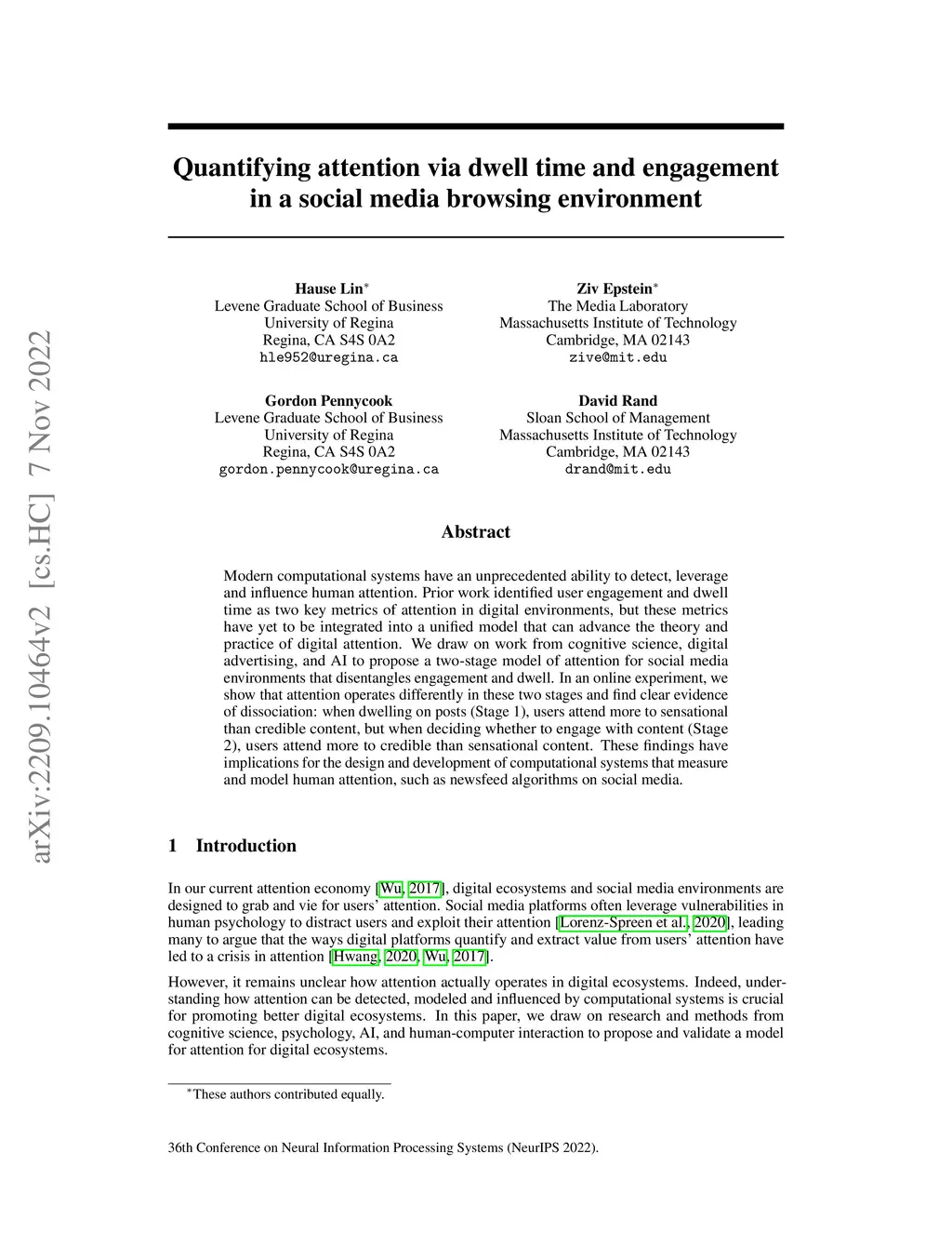 Modern computational systems have an unprecedented ability to detect, leverage and influence human attention. Prior work identified user engagement and dwell time as two key metrics of attention in digital environments, but these metrics have yet to be integrated into a unified model that can advance the theory andpractice of digital attention. We draw on work from cognitive science, digital advertising, and AI to propose a two-stage model of attention for social media environments that disentangles engagement and dwell. In an online experiment, we show that attention operates differently in these two stages and find clear evidence of dissociation: when dwelling on posts (Stage 1), users attend more to sensational than credible content, but when deciding whether to engage with content (Stage 2), users attend more to credible than sensational content. These findings have implications for the design and development of computational systems that measure and model human attention, such as newsfeed algorithms on social media.