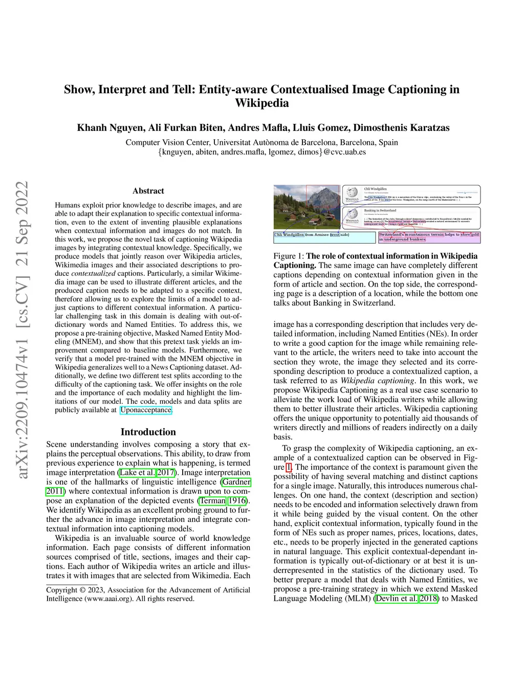 Humans exploit prior knowledge to describe images, and are able to adapt their explanation to specific contextual information, even to the extent of inventing plausible explanations when contextual information and images do not match. In this work, we propose the novel task of captioning Wikipedia images by integrating contextual knowledge. Specifically, we produce models that jointly reason over Wikipedia articles, Wikimedia images and their associated descriptions to produce contextualized captions. Particularly, a similar Wikimedia image can be used to illustrate different articles, and the produced caption needs to be adapted to a specific context, therefore allowing us to explore the limits of a model to adjust captions to different contextual information. A particular challenging task in this domain is dealing with out-of-dictionary words and Named Entities. To address this, we propose a pre-training objective, Masked Named Entity Modeling (MNEM), and show that this pretext task yields an improvement compared to baseline models. Furthermore, we verify that a model pre-trained with the MNEM objective in Wikipedia generalizes well to a News Captioning dataset. Additionally, we define two different test splits according to the difficulty of the captioning task. We offer insights on the role and the importance of each modality and highlight the limitations of our model. The code, models and data splits are publicly available at Upon acceptance.