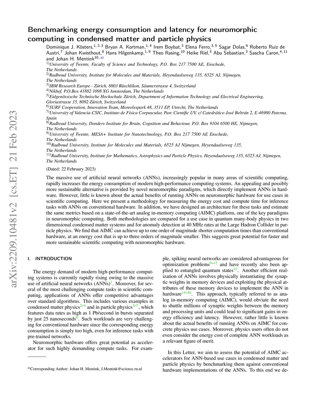 The massive use of artificial neural networks (ANNs), increasingly popular in many areas of scientific computing, rapidly increases the energy consumption of modern high-performance computing systems. An appealing and possibly more sustainable alternative is provided by novel neuromorphic paradigms, which directly implement ANNs in hardware. However, little is known about the actual benefits of running ANNs on neuromorphic hardware for use cases in scientific computing. Here we present a methodology for measuring the energy cost and compute time for inference tasks with ANNs on conventional hardware. In addition, we have designed an architecture for these tasks and estimate the same metrics based on a state-of-the-art analog in-memory computing (AIMC) platform, one of the key paradigms in neuromorphic computing. Both methodologies are compared for a use case in quantum many-body physics in two dimensional condensed matter systems and for anomaly detection at 40 MHz rates at the Large Hadron Collider in particle physics. We find that AIMC can achieve up to one order of magnitude shorter computation times than conventional hardware, at an energy cost that is up to three orders of magnitude smaller. This suggests great potential for faster and more sustainable scientific computing with neuromorphic hardware.