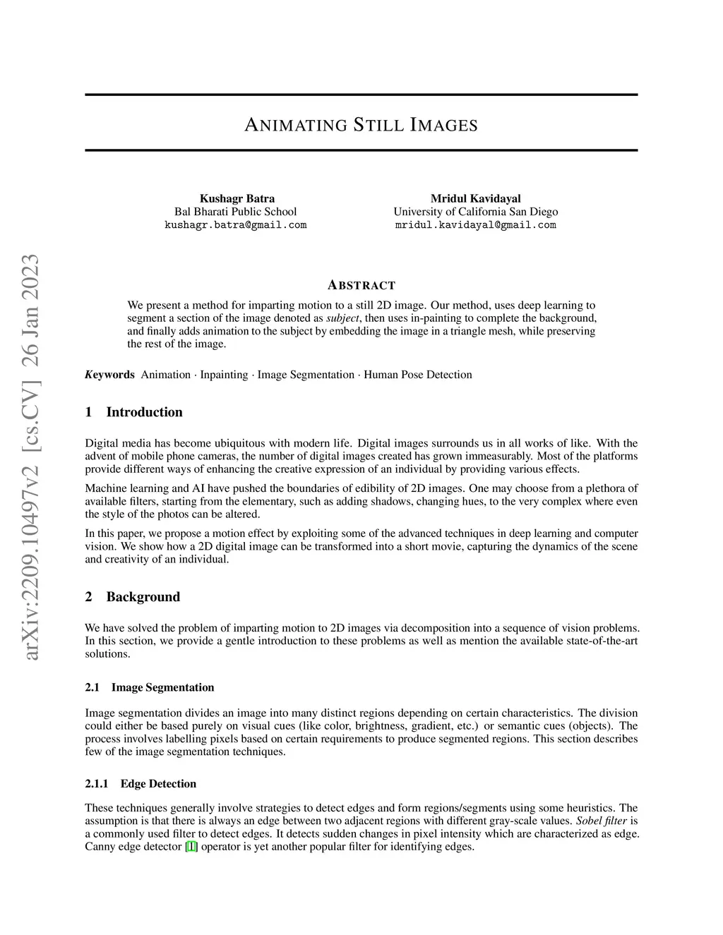 We present a method for imparting motion to a still 2D image. Our method uses deep learning to segment a section of the image denoted as subject, then uses in-painting to complete the background, and finally adds animation to the subject by embedding the image in a triangle mesh, while preserving the rest of the image.