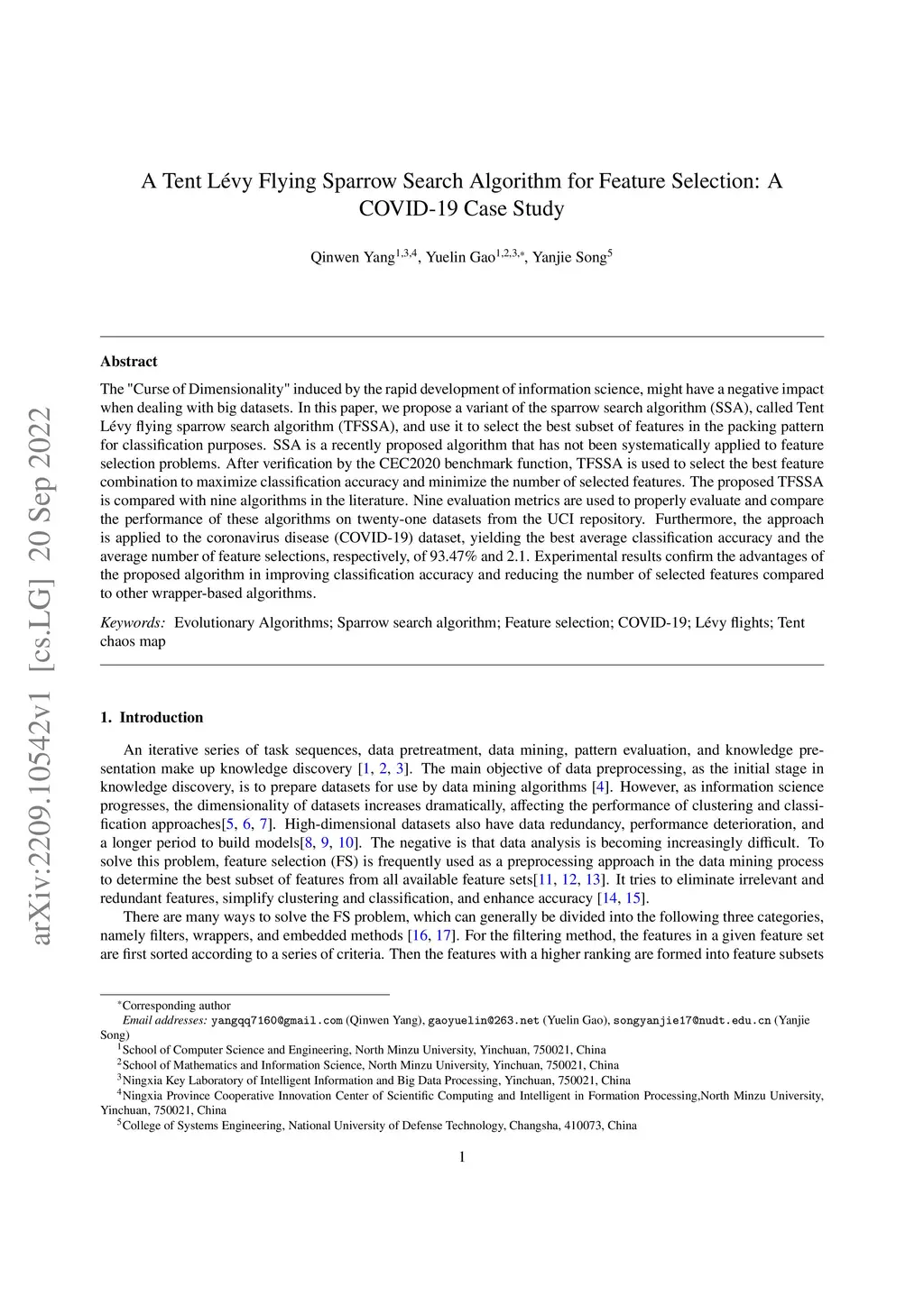 The "Curse of Dimensionality" induced by the rapid development of information science, might have a negative impact when dealing with big datasets. In this paper, we propose a variant of the sparrow search algorithm (SSA), called Tent L\évy flying sparrow search algorithm (TFSSA), and use it to select the best subset of features in the packing pattern for classification purposes. SSA is a recently proposed algorithm that has not been systematically applied to feature selection problems. After verification by the CEC2020 benchmark function, TFSSA is used to select the best feature combination to maximize classification accuracy and minimize the number of selected features. The proposed TFSSA is compared with nine algorithms in the literature. Nine evaluation metrics are used to properly evaluate and compare the performance of these algorithms on twenty-one datasets from the UCI repository. Furthermore, the approach is applied to the coronavirus disease (COVID-19) dataset, yielding the best average classification accuracy and the average number of feature selections, respectively, of 93.47% and 2.1. Experimental results confirm the advantages of the proposed algorithm in improving classification accuracy and reducing the number of selected features compared to other wrapper-based algorithms.