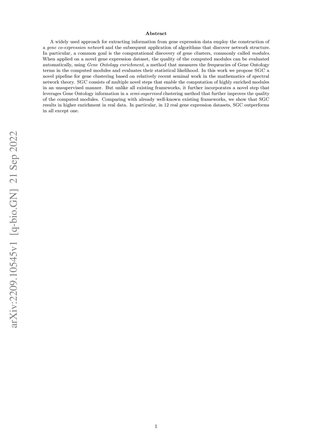 A widely used approach for extracting information from gene expression data employ the construction of a gene co-expression network and the subsequent application of algorithms that discover network structure. In particular, a common goal is the computational discovery of gene clusters, commonly called modules. When applied on a novel gene expression dataset, the quality of the computed modules can be evaluated automatically, using Gene Ontology enrichment, a method that measures the frequencies of Gene Ontology terms in the computed modules and evaluates their statistical likelihood. In this work we propose SGC a novel pipeline for gene clustering based on relatively recent seminal work in the mathematics of spectral network theory. SGC consists of multiple novel steps that enable the computation of highly enriched modules in an unsupervised manner. But unlike all existing frameworks, it further incorporates a novel step that leverages Gene Ontology information in a semi-supervised clustering method that further improves the quality of the computed modules. Comparing with already well-known existing frameworks, we show that SGC results in higher enrichment in real data. In particular, in 12 real gene expression datasets, SGC outperforms in all except one.
