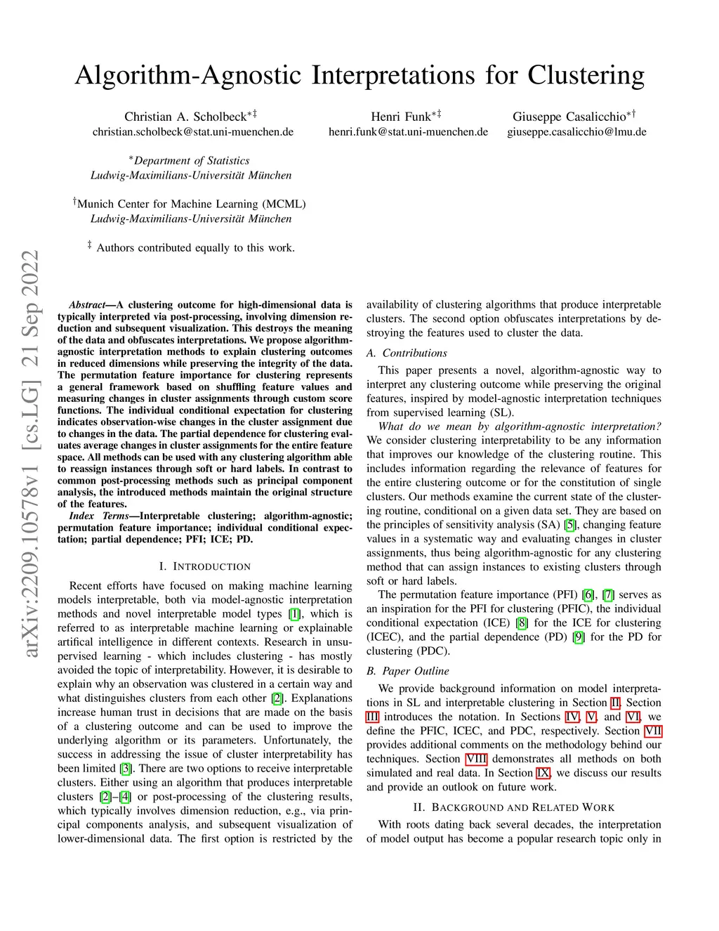 A clustering outcome for high-dimensional data is typically interpreted via post-processing, involving dimension reduction and subsequent visualization. This destroys the meaning of the data and obfuscates interpretations. We propose algorithm-agnostic interpretation methods to explain clustering outcomes in reduced dimensions while preserving the integrity of the data. The permutation feature importance for clustering represents a general framework based on shuffling feature values and measuring changes in cluster assignments through custom score functions. The individual conditional expectation for clustering indicates observation-wise changes in the cluster assignment due to changes in the data. The partial dependence for clustering evaluates average changes in cluster assignments for the entire feature space. All methods can be used with any clustering algorithm able to reassign instances through soft or hard labels. In contrast to common post-processing methods such as principal component analysis, the introduced methods maintain the original structure of the features.
