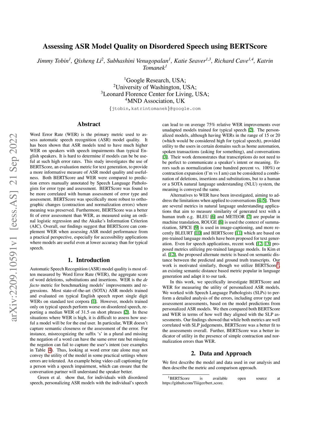 Word Error Rate (WER) is the primary metric used to assess automatic speech recognition (ASR) model quality. It has been shown that ASR models tend to have much higher WER on speakers with speech impairments than typical English speakers. It is hard to determine if models can be be useful at such high error rates. This study investigates the use of BERTScore, an evaluation metric for text generation, to provide a more informative measure of ASR model quality and usefulness. Both BERTScore and WER were compared to prediction errors manually annotated by Speech Language Pathologists for error type and assessment. BERTScore was found to be more correlated with human assessment of error type and assessment. BERTScore was specifically more robust to orthographic changes (contraction and normalization errors) where meaning was preserved. Furthermore, BERTScore was a better fit of error assessment than WER, as measured using an ordinal logistic regression and the Akaike's Information Criterion (AIC). Overall, our findings suggest that BERTScore can complement WER when assessing ASR model performance from a practical perspective, especially for accessibility applications where models are useful even at lower accuracy than for typical speech.