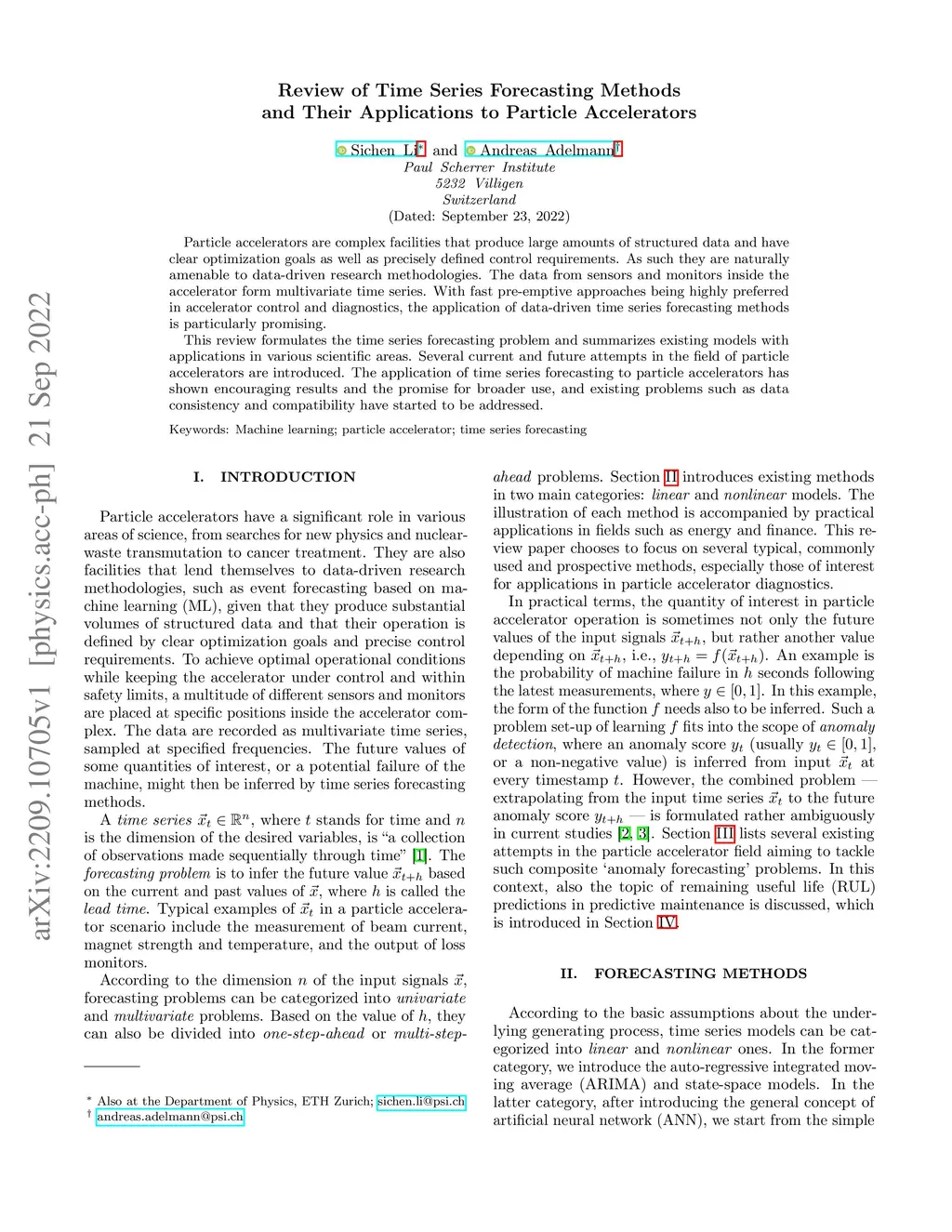 Particle accelerators are complex facilities that produce large amounts of structured data and have clear optimization goals as well as precisely defined control requirements. As such they are naturally amenable to data-driven research methodologies. The data from sensors and monitors inside the accelerator form multivariate time series. With fast pre-emptive approaches being highly preferred in accelerator control and diagnostics, the application of data-driven time series forecasting methods is particularly promising. This review formulates the time series forecasting problem and summarizes existing models with applications in various scientific areas. Several current and future attempts in the field of particle accelerators are introduced. The application of time series forecasting to particle accelerators has shown encouraging results and the promise for broader use, and existing problems such as data consistency and compatibility have started to be addressed.