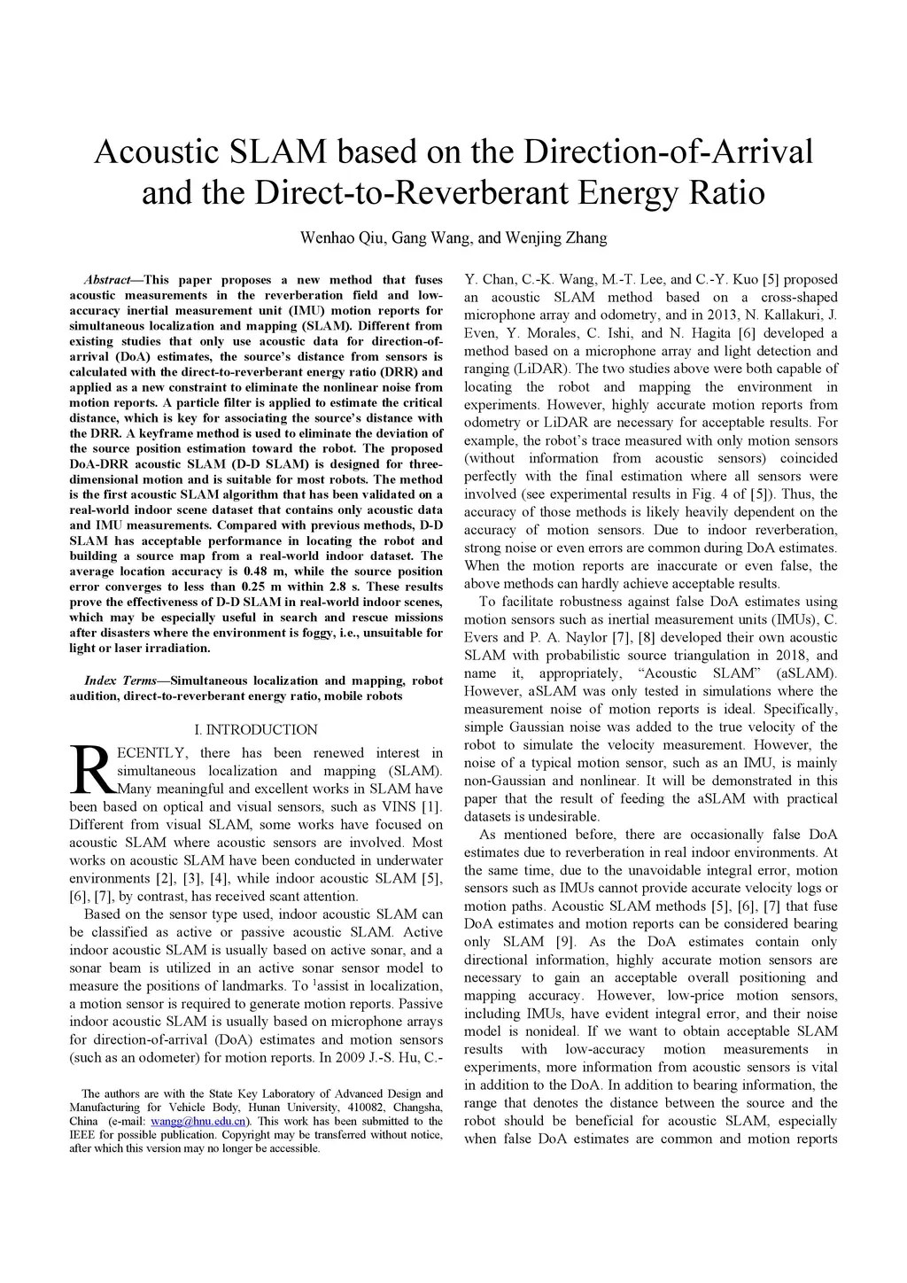 This paper proposes a new method that fuses acoustic measurements in the reverberation field and low-accuracy inertial measurement unit (IMU) motion reports for simultaneous localization and mapping (SLAM). Different from existing studies that only use acoustic data for direction-of-arrival (DoA) estimates, the source's distance from sensors is calculated with the direct-to-reverberant energy ratio (DRR) and applied as a new constraint to eliminate the nonlinear noise from motion reports. A particle filter is applied to estimate the critical distance, which is key for associating the source's distance with the DRR. A keyframe method is used to eliminate the deviation of the source position estimation toward the robot. The proposed DoA-DRR acoustic SLAM (D-D SLAM) is designed for three-dimensional motion and is suitable for most robots. The method is the first acoustic SLAM algorithm that has been validated on a real-world indoor scene dataset that contains only acoustic data and IMU measurements. Compared with previous methods, D-D SLAM has acceptable performance in locating the robot and building a source map from a real-world indoor dataset. The average location accuracy is 0.48 m, while the source position error converges to less than 0.25 m within 2.8 s. These results prove the effectiveness of D-D SLAM in real-world indoor scenes, which may be especially useful in search and rescue missions after disasters where the environment is foggy, i.e., unsuitable for light or laser irradiation.
