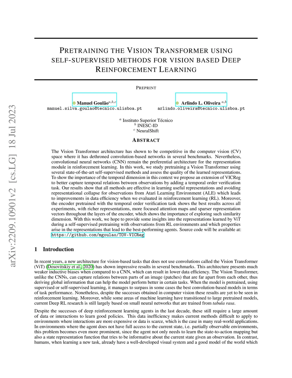 The Vision Transformer architecture has shown to be competitive in the computer vision (CV) space where it has dethroned convolution-based networks in several benchmarks. Nevertheless, convolutional neural networks (CNN) remain the preferential architecture for the representation module in reinforcement learning. In this work, we study pretraining a Vision Transformer using several state-of-the-art self-supervised methods and assess the quality of the learned representations. To show the importance of the temporal dimension in this context we propose an extension of VICReg to better capture temporal relations between observations by adding a temporal order verification task. Our results show that all methods are effective in learning useful representations and avoiding representational collapse for observations from Atari Learning Environment (ALE) which leads to improvements in data efficiency when we evaluated in reinforcement learning (RL). Moreover, the encoder pretrained with the temporal order verification task shows the best results across all experiments, with richer representations, more focused attention maps and sparser representation vectors throughout the layers of the encoder, which shows the importance of exploring such similarity dimension. With this work, we hope to provide some insights into the representations learned by ViT during a self-supervised pretraining with observations from RL environments and which properties arise in the representations that lead to the best-performing agents. The source code will be available at: https://github.com/mgoulao/TOV-VICReg