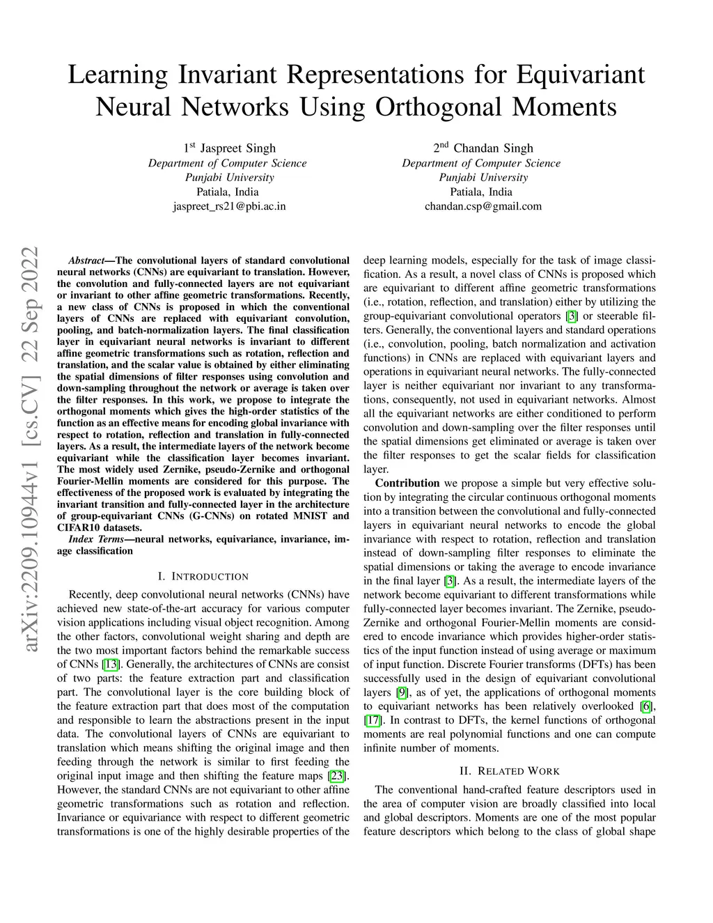 The convolutional layers of standard convolutional neural networks (CNNs) are equivariant to translation. However, the convolution and fully-connected layers are not equivariant or invariant to other affine geometric transformations. Recently, a new class of CNNs is proposed in which the conventional layers of CNNs are replaced with equivariant convolution, pooling, and batch-normalization layers. The final classification layer in equivariant neural networks is invariant to different affine geometric transformations such as rotation, reflection and translation, and the scalar value is obtained by either eliminating the spatial dimensions of filter responses using convolution and down-sampling throughout the network or average is taken over the filter responses. In this work, we propose to integrate the orthogonal moments which gives the high-order statistics of the function as an effective means for encoding global invariance with respect to rotation, reflection and translation in fully-connected layers. As a result, the intermediate layers of the network become equivariant while the classification layer becomes invariant. The most widely used Zernike, pseudo-Zernike and orthogonal Fourier-Mellin moments are considered for this purpose. The effectiveness of the proposed work is evaluated by integrating the invariant transition and fully-connected layer in the architecture of group-equivariant CNNs (G-CNNs) on rotated MNIST and CIFAR10 datasets.