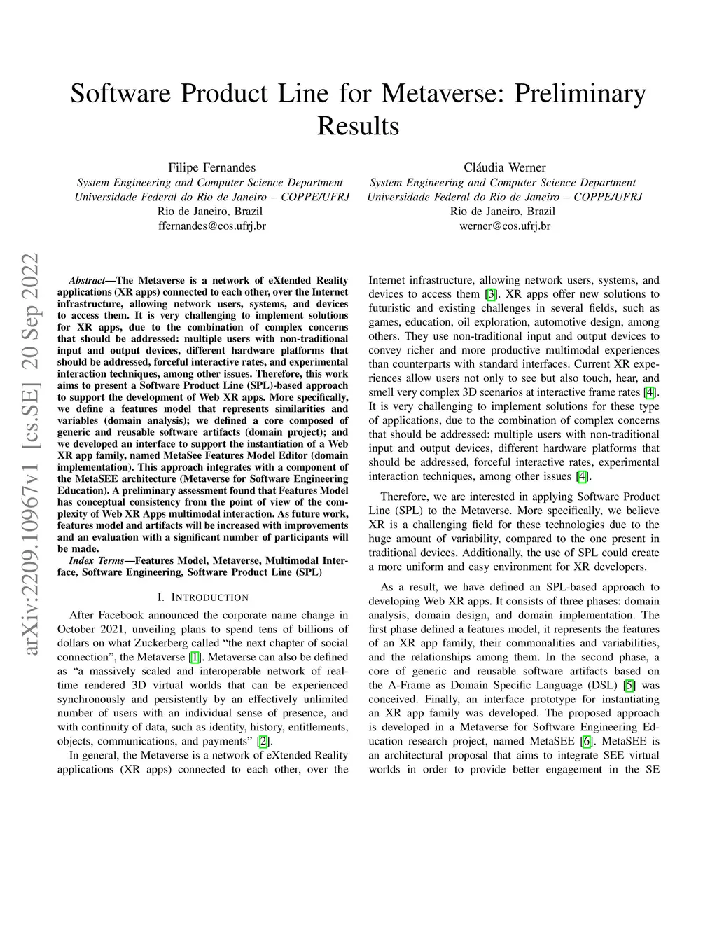 The Metaverse is a network of eXtended Reality applications (XR apps) connected to each other, over the Internet infrastructure, allowing network users, systems, and devices to access them. It is very challenging to implement solutions for XR apps, due to the combination of complex concerns that should be addressed: multiple users with non-traditional input and output devices, different hardware platforms that should be addressed, forceful interactive rates, and experimental interaction techniques, among other issues. Therefore, this work aims to present a Software Product Line (SPL)-based approach to support the development of Web XR apps. More specifically, we define a features model that represents similarities and variables (domain analysis); we defined a core composed of generic and reusable software artifacts (domain project); and we developed an interface to support the instantiation of a Web XR app family, named MetaSee Features Model Editor (domain implementation). This approach integrates with a component of the MetaSEE architecture (Metaverse for Software Engineering Education). A preliminary assessment found that Features Model has conceptual consistency from the point of view of the complexity of Web XR Apps multimodal interaction. As future work, features model and artifacts will be increased with improvements and an evaluation with a significant number of participants will be made.