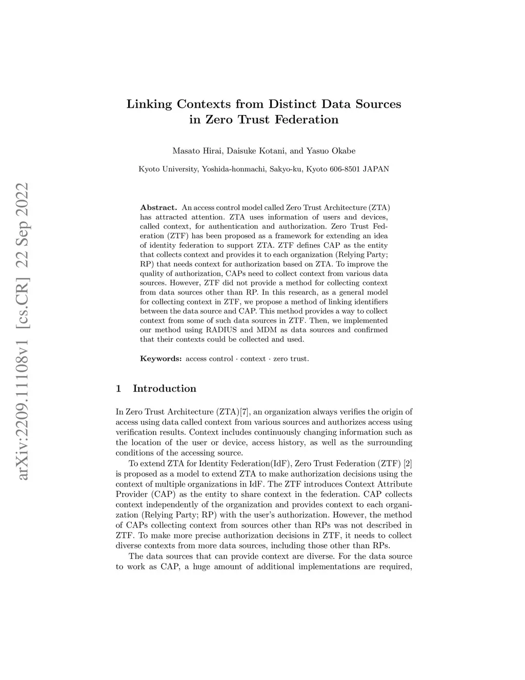 An access control model called Zero Trust Architecture (ZTA) has attracted attention. ZTA uses information of users and devices, called context, for authentication and authorization. Zero Trust Federation (ZTF) has been proposed as a framework for extending an idea of identity federation to support ZTA. ZTF defines CAP as the entity that collects context and provides it to each organization (Relying Party; RP) that needs context for authorization based on ZTA. To improve the quality of authorization, CAPs need to collect context from various data sources. However, ZTF did not provide a method for collecting context from data sources other than RP. In this research, as a general model for collecting context in ZTF, we propose a method of linking identifiers between the data source and CAP. This method provides a way to collect context from some of such data sources in ZTF. Then, we implemented our method using RADIUS and MDM as data sources and confirmed that their contexts could be collected and used.