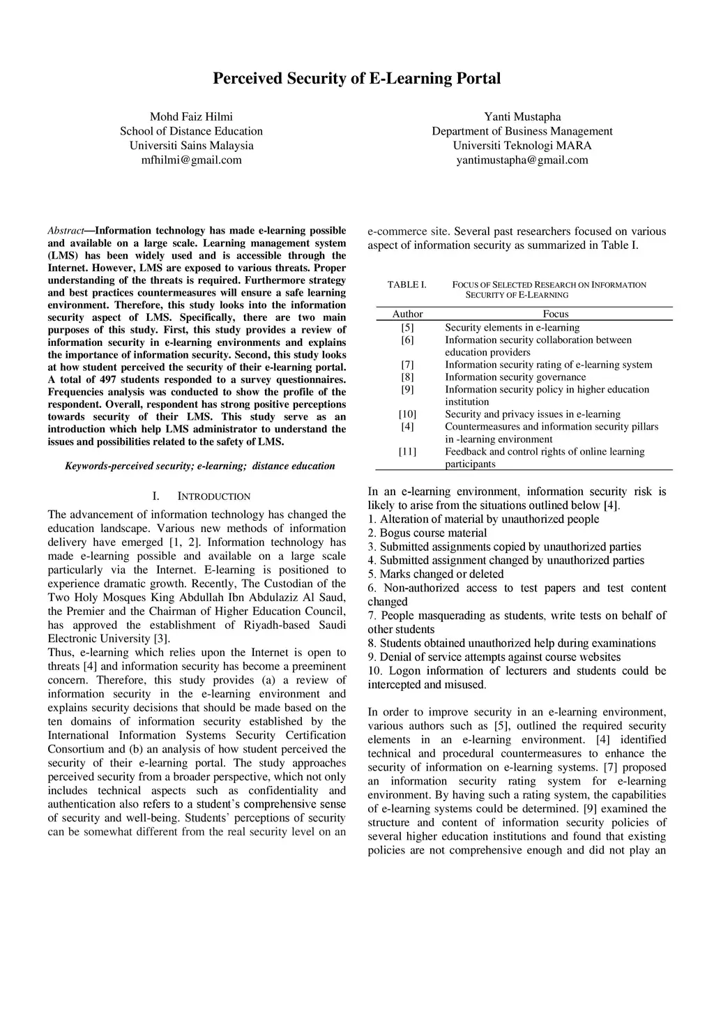Information technology has made e-learning possible and available on a large scale. Learning management system (LMS) has been widely used and is accessible through the Internet. However, LMS are exposed to various threats. Proper understanding of the threats is required. Furthermore strategy and best practices countermeasures will ensure a safe learning environment. Therefore, this study looks into the information security aspect of LMS. Specifically, there are two main purposes of this study. First, this study provides a review of information security in e-learning environments and explains the importance of information security. Second, this study looks at how student perceived the security of their e-learning portal. A total of 497 students responded to a survey questionnaires. Frequencies analysis was conducted to show the profile of the respondent. Overall, respondent has strong positive perceptions towards security of their LMS. This study serve as an introduction which help LMS administrator to understand the issues and possibilities related to the safety of LMS.
