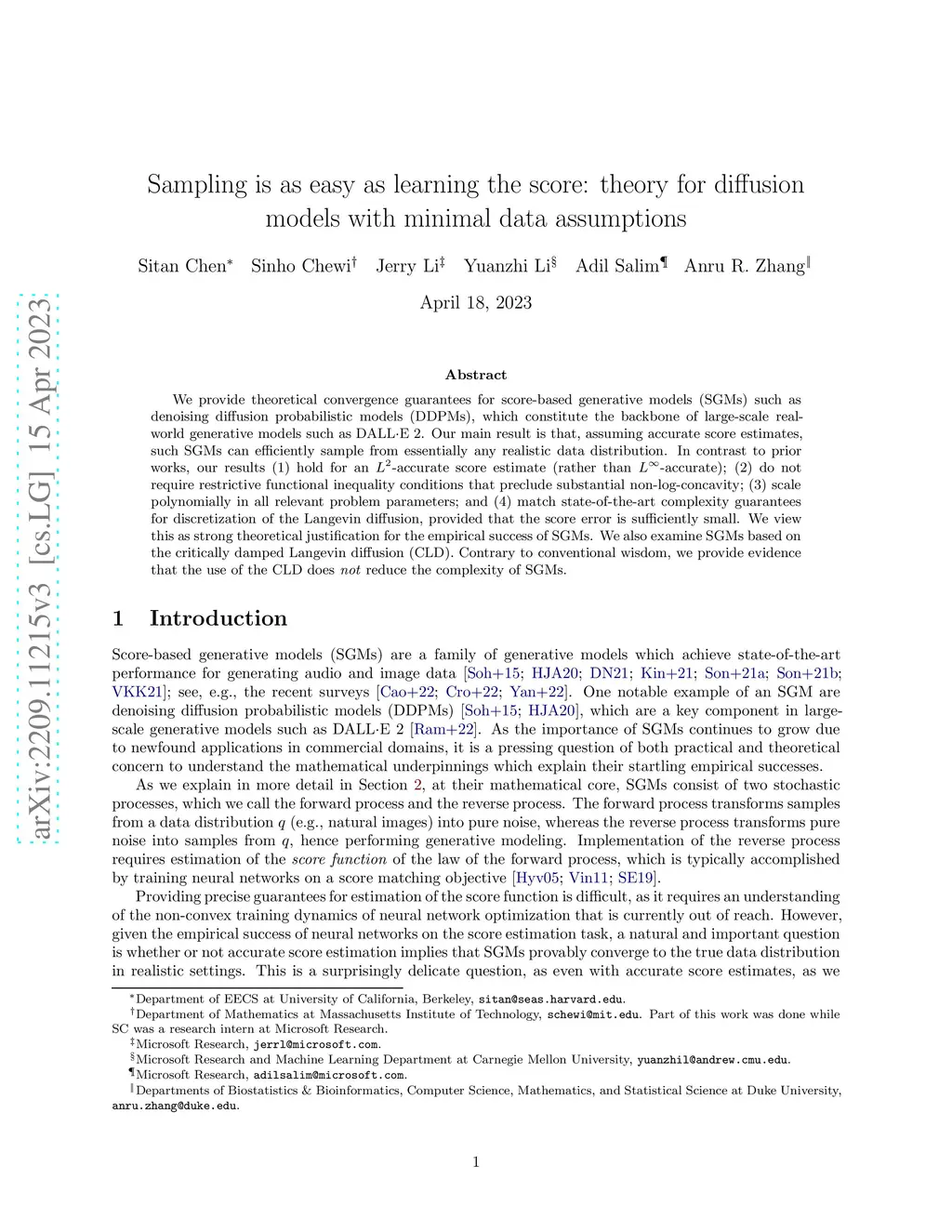 We provide theoretical convergence guarantees for score-based generative models (SGMs) such as denoising diffusion probabilistic models (DDPMs), which constitute the backbone of large-scale real-world generative models such as DALLE 2. Our main result is that, assuming accurate score estimates, such SGMs can efficiently sample from essentially any realistic data distribution. In contrast to prior works, our results (1) hold for an -accurate score estimate (rather than -accurate); (2) do not require restrictive functional inequality conditions that preclude substantial non-log-concavity; (3) scale polynomially in all relevant problem parameters; and (4) match state-of-the-art complexity guarantees for discretization of the Langevin diffusion, provided that the score error is sufficiently small. We view this as strong theoretical justification for the empirical success of SGMs. We also examine SGMs based on the critically damped Langevin diffusion (CLD). Contrary to conventional wisdom, we provide evidence that the use of the CLD does not reduce the complexity of SGMs.