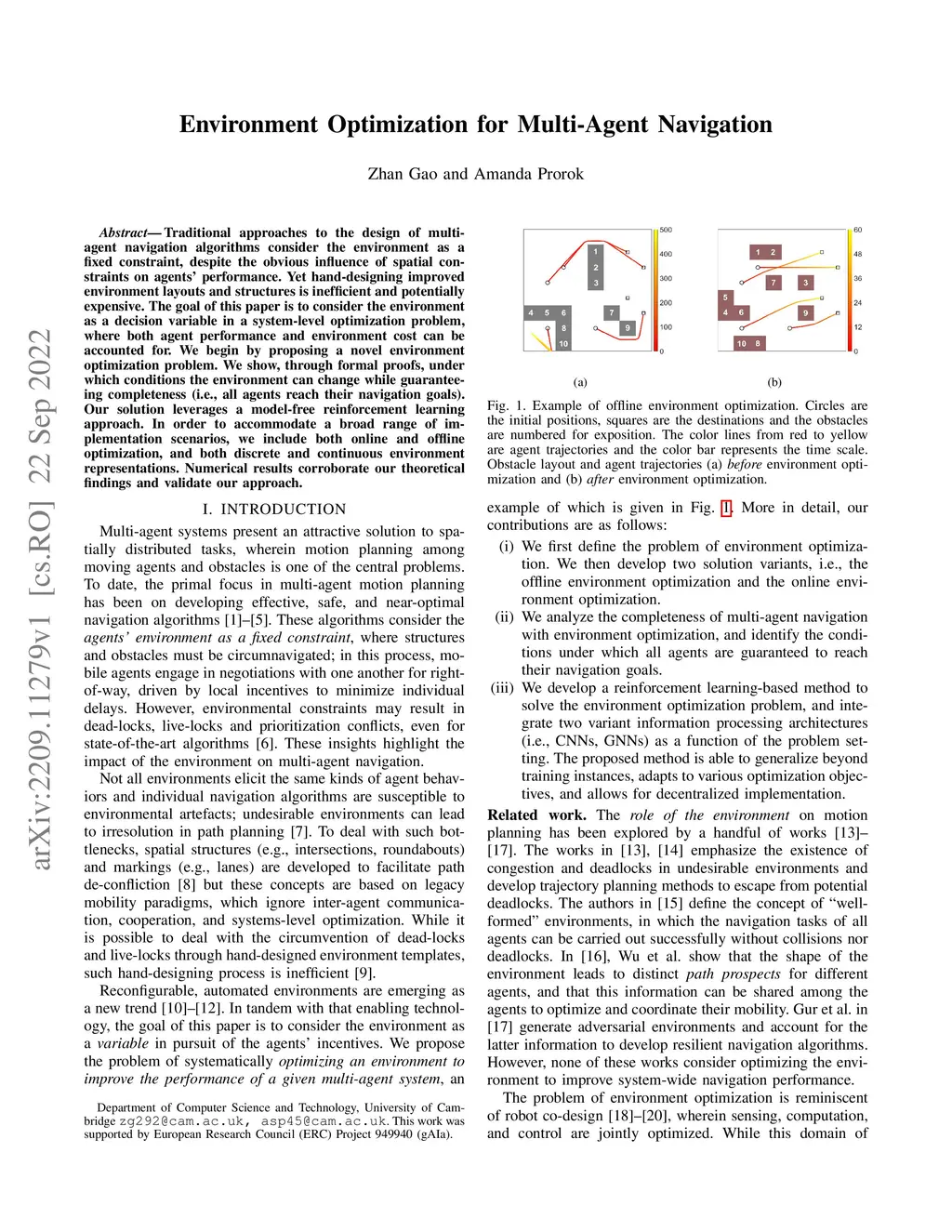 Traditional approaches to the design of multi-agent navigation algorithms consider the environment as a fixed constraint, despite the obvious influence of spatial constraints on agents' performance. Yet hand-designing improved environment layouts and structures is inefficient and potentially expensive. The goal of this paper is to consider the environment as a decision variable in a system-level optimization problem, where both agent performance and environment cost can be accounted for. We begin by proposing a novel environment optimization problem. We show, through formal proofs, under which conditions the environment can change while guaranteeing completeness (i.e., all agents reach their navigation goals). Our solution leverages a model-free reinforcement learning approach. In order to accommodate a broad range of implementation scenarios, we include both online and offline optimization, and both discrete and continuous environment representations. Numerical results corroborate our theoretical findings and validate our approach.