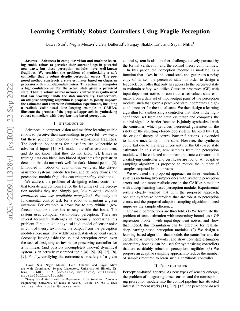 Advances in computer vision and machine learning enable robots to perceive their surroundings in powerful new ways, but these perception modules have well-known fragilities. We consider the problem of synthesizing a safe controller that is robust despite perception errors. The proposed method constructs a state estimator based on Gaussian processes with input-dependent noises. This estimator computes a high-confidence set for the actual state given a perceived state. Then, a robust neural network controller is synthesized that can provably handle the state uncertainty. Furthermore, an adaptive sampling algorithm is proposed to jointly improve the estimator and controller. Simulation experiments, including a realistic vision-based lane-keeping example in CARLA, illustrate the promise of the proposed approach in synthesizing robust controllers with deep-learning-based perception.