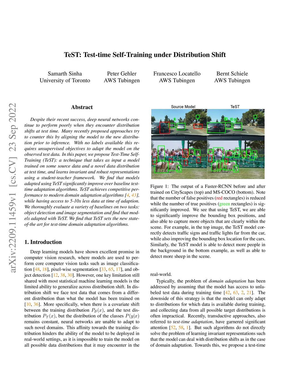 Despite their recent success, deep neural networks continue to perform poorly when they encounter distribution shifts at test time. Many recently proposed approaches try to counter this by aligning the model to the new distribution prior to inference. With no labels available this requires unsupervised objectives to adapt the model on the observed test data. In this paper, we propose Test-Time Self-Training (TeST): a technique that takes as input a model trained on some source data and a novel data distribution at test time, and learns invariant and robust representations using a student-teacher framework. We find that models adapted using TeST significantly improve over baseline test-time adaptation algorithms. TeST achieves competitive performance to modern domain adaptation algorithms, while having access to 5-10x less data at time of adaption. We thoroughly evaluate a variety of baselines on two tasks: object detection and image segmentation and find that models adapted with TeST. We find that TeST sets the new state-of-the art for test-time domain adaptation algorithms.