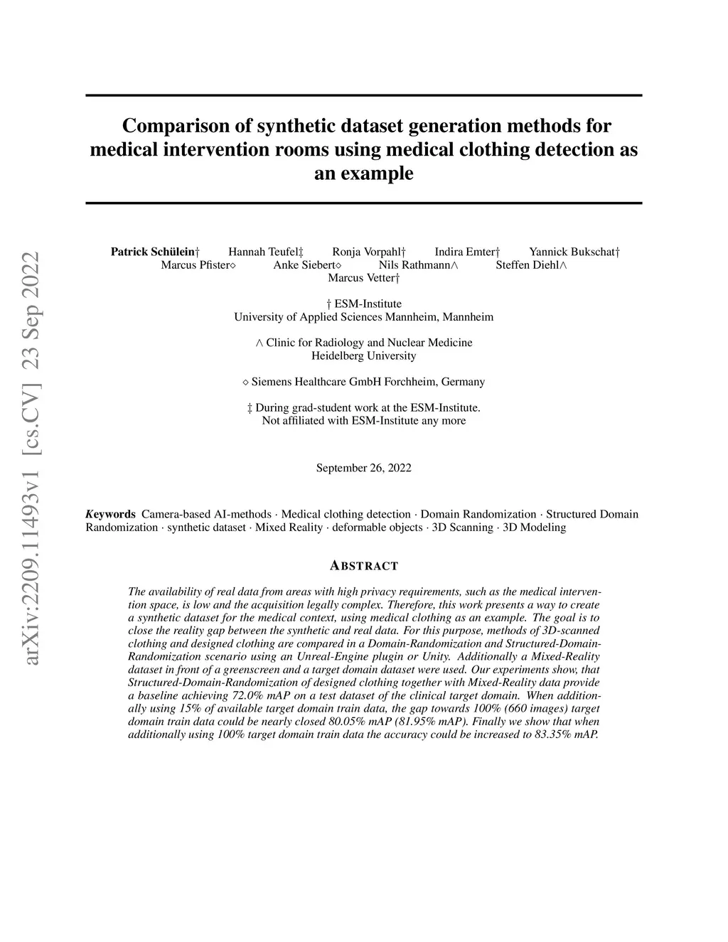 The availability of real data from areas with high privacy requirements, such as the medical intervention space, is low and the acquisition legally complex. Therefore, this work presents a way to create a synthetic dataset for the medical context, using medical clothing as an example. The goal is to close the reality gap between the synthetic and real data. For this purpose, methods of 3D-scanned clothing and designed clothing are compared in a Domain-Randomization and Structured-Domain-Randomization scenario using an Unreal-Engine plugin or Unity. Additionally a Mixed-Reality dataset in front of a greenscreen and a target domain dataset were used. Our experiments show, that Structured-Domain-Randomization of designed clothing together with Mixed-Reality data provide a baseline achieving 72.0% mAP on a test dataset of the clinical target domain. When additionally using 15% of available target domain train data, the gap towards 100% (660 images) target domain train data could be nearly closed 80.05% mAP (81.95% mAP). Finally we show that when additionally using 100% target domain train data the accuracy could be increased to 83.35% mAP.