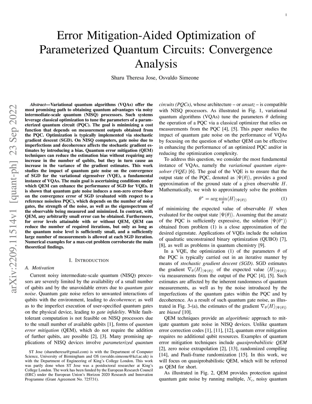 Variational quantum algorithms (VQAs) offer the most promising path to obtaining quantum advantages via noisy intermediate-scale quantum (NISQ) processors. Such systems leverage classical optimization to tune the parameters of a parameterized quantum circuit (PQC). The goal is minimizing a cost function that depends on measurement outputs obtained from the PQC. Optimization is typically implemented via stochastic gradient descent (SGD). On NISQ computers, gate noise due to imperfections and decoherence affects the stochastic gradient estimates by introducing a bias. Quantum error mitigation (QEM) techniques can reduce the estimation bias without requiring any increase in the number of qubits, but they in turn cause an increase in the variance of the gradient estimates. This work studies the impact of quantum gate noise on the convergence of SGD for the variational eigensolver (VQE), a fundamental instance of VQAs. The main goal is ascertaining conditions under which QEM can enhance the performance of SGD for VQEs. It is shown that quantum gate noise induces a non-zero error-floor on the convergence error of SGD (evaluated with respect to a reference noiseless PQC), which depends on the number of noisy gates, the strength of the noise, as well as the eigenspectrum of the observable being measured and minimized. In contrast, with QEM, any arbitrarily small error can be obtained. Furthermore, for error levels attainable with or without QEM, QEM can reduce the number of required iterations, but only as long as the quantum noise level is sufficiently small, and a sufficiently large number of measurements is allowed at each SGD iteration. Numerical examples for a max-cut problem corroborate the main theoretical findings.