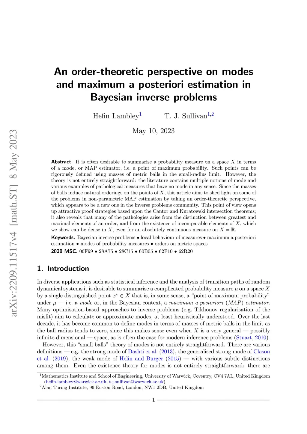 It is often desirable to summarise a probability measure on a space in terms of a mode, or MAP estimator, i.e.\ a point of maximum probability. Such points can be rigorously defined using masses of metric balls in the small-radius limit. However, the theory is not entirely straightforward: the literature contains multiple notions of mode and various examples of pathological measures that have no mode in any sense. Since the masses of balls induce natural orderings on the points of , this article aims to shed light on some of the problems in non-parametric MAP estimation by taking an order-theoretic perspective, which appears to be a new one in the inverse problems community. This point of view opens up attractive proof strategies based upon the Cantor and Kuratowski intersection theorems; it also reveals that many of the pathologies arise from the distinction between greatest and maximal elements of an order, and from the existence of incomparable elements of , which we show can be dense in , even for an absolutely continuous measure on .