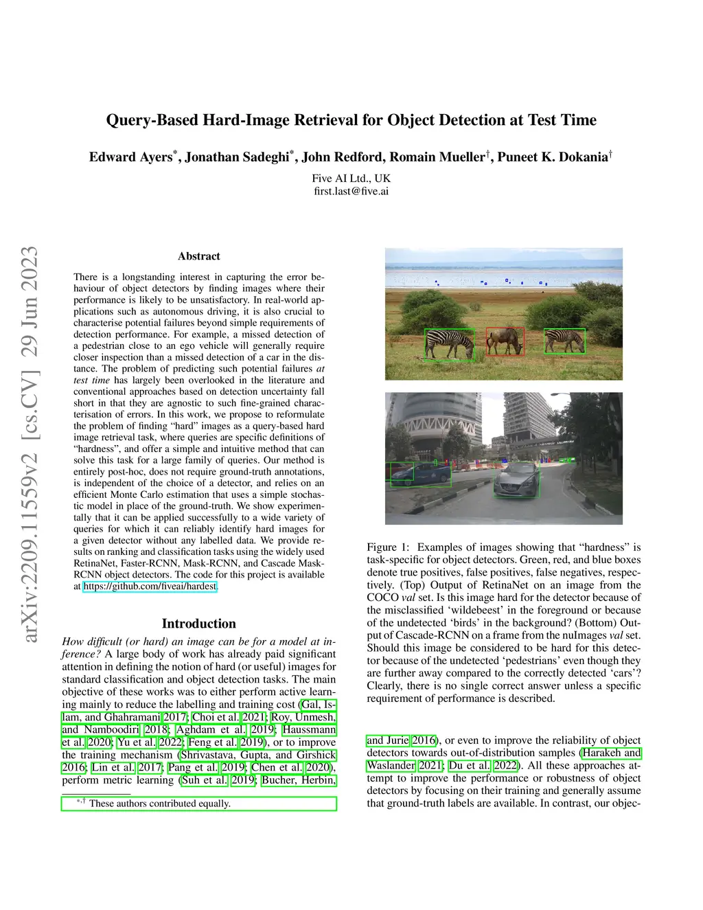 There is a longstanding interest in capturing the error behaviour of object detectors by finding images where their performance is likely to be unsatisfactory. In real-world applications such as autonomous driving, it is also crucial to characterise potential failures beyond simple requirements of detection performance. For example, a missed detection of a pedestrian close to an ego vehicle will generally require closer inspection than a missed detection of a car in the distance. The problem of predicting such potential failures at test time has largely been overlooked in the literature and conventional approaches based on detection uncertainty fall short in that they are agnostic to such fine-grained characterisation of errors. In this work, we propose to reformulate the problem of finding "hard" images as a query-based hard image retrieval task, where queries are specific definitions of "hardness", and offer a simple and intuitive method that can solve this task for a large family of queries. Our method is entirely post-hoc, does not require ground-truth annotations, is independent of the choice of a detector, and relies on an efficient Monte Carlo estimation that uses a simple stochastic model in place of the ground-truth. We show experimentally that it can be applied successfully to a wide variety of queries for which it can reliably identify hard images for a given detector without any labelled data. We provide results on ranking and classification tasks using the widely used RetinaNet, Faster-RCNN, Mask-RCNN, and Cascade Mask-RCNN object detectors. The code for this project is available at https://github.com/fiveai/hardest.