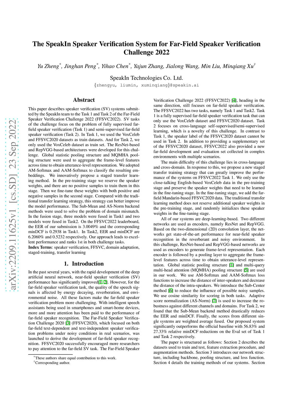 This paper describes speaker verification (SV) systems submitted by the SpeakIn team to the Task 1 and Task 2 of the Far-Field Speaker Verification Challenge 2022 (FFSVC2022). SV tasks of the challenge focus on the problem of fully supervised far-field speaker verification (Task 1) and semi-supervised far-field speaker verification (Task 2). In Task 1, we used the VoxCeleb and FFSVC2020 datasets as train datasets. And for Task 2, we only used the VoxCeleb dataset as train set. The ResNet-based and RepVGG-based architectures were developed for this challenge. Global statistic pooling structure and MQMHA pooling structure were used to aggregate the frame-level features across time to obtain utterance-level representation. We adopted AM-Softmax and AAM-Softmax to classify the resulting embeddings. We innovatively propose a staged transfer learning method. In the pre-training stage we reserve the speaker weights, and there are no positive samples to train them in this stage. Then we fine-tune these weights with both positive and negative samples in the second stage. Compared with the traditional transfer learning strategy, this strategy can better improve the model performance. The Sub-Mean and AS-Norm backend methods were used to solve the problem of domain mismatch. In the fusion stage, three models were fused in Task1 and two models were fused in Task2. On the FFSVC2022 leaderboard, the EER of our submission is 3.0049% and the corresponding minDCF is 0.2938 in Task1. In Task2, EER and minDCF are 6.2060% and 0.5232 respectively. Our approach leads to excellent performance and ranks 1st in both challenge tasks.