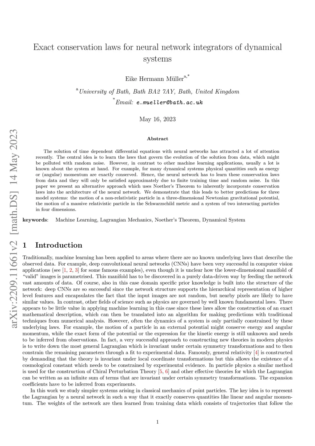 The solution of time dependent differential equations with neural networks has attracted a lot of attention recently. The central idea is to learn the laws that govern the evolution of the solution from data, which might be polluted with random noise. However, in contrast to other machine learning applications, usually a lot is known about the system at hand. For example, for many dynamical systems physical quantities such as energy or (angular) momentum are exactly conserved. Hence, the neural network has to learn these conservation laws from data and they will only be satisfied approximately due to finite training time and random noise. In this paper we present an alternative approach which uses Noether's Theorem to inherently incorporate conservation laws into the architecture of the neural network. We demonstrate that this leads to better predictions for three model systems: the motion of a non-relativistic particle in a three-dimensional Newtonian gravitational potential, the motion of a massive relativistic particle in the Schwarzschild metric and a system of two interacting particles in four dimensions.