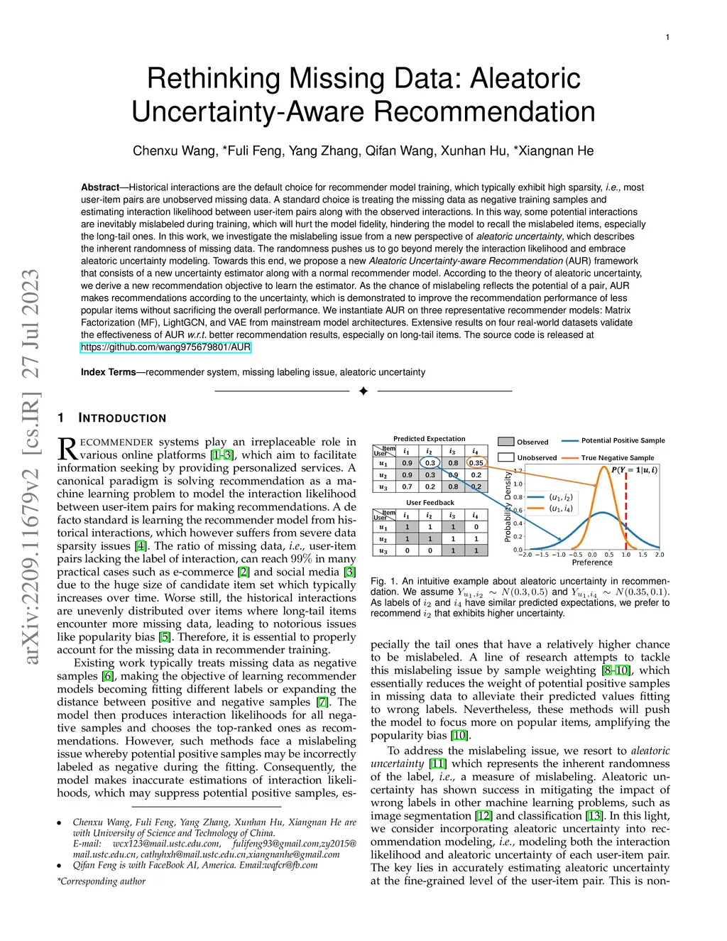 Historical interactions are the default choice for recommender model training, which typically exhibit high sparsity, i.e., most user-item pairs are unobserved missing data. A standard choice is treating the missing data as negative training samples and estimating interaction likelihood between user-item pairs along with the observed interactions. In this way, some potential interactions are inevitably mislabeled during training, which will hurt the model fidelity, hindering the model to recall the mislabeled items, especially the long-tail ones. In this work, we investigate the mislabeling issue from a new perspective of aleatoric uncertainty, which describes the inherent randomness of missing data. The randomness pushes us to go beyond merely the interaction likelihood and embrace aleatoric uncertainty modeling. Towards this end, we propose a new Aleatoric Uncertainty-aware Recommendation (AUR) framework that consists of a new uncertainty estimator along with a normal recommender model. According to the theory of aleatoric uncertainty, we derive a new recommendation objective to learn the estimator. As the chance of mislabeling reflects the potential of a pair, AUR makes recommendations according to the uncertainty, which is demonstrated to improve the recommendation performance of less popular items without sacrificing the overall performance. We instantiate AUR on three representative recommender models: Matrix Factorization (MF), LightGCN, and VAE from mainstream model architectures. Extensive results on two real-world datasets validate the effectiveness of AUR w.r.t. better recommendation results, especially on long-tail items.