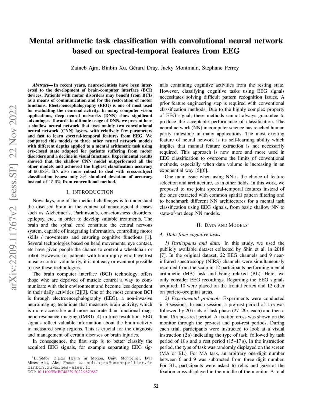 In recent years, neuroscientists have been interested to the development of brain-computer interface (BCI) devices. Patients with motor disorders may benefit from BCIs as a means of communication and for the restoration of motor functions. Electroencephalography (EEG) is one of most used for evaluating the neuronal activity. In many computer vision applications, deep neural networks (DNN) show significant advantages. Towards to ultimate usage of DNN, we present here a shallow neural network that uses mainly two convolutional neural network (CNN) layers, with relatively few parameters and fast to learn spectral-temporal features from EEG. We compared this models to three other neural network models with different depths applied to a mental arithmetic task using eye-closed state adapted for patients suffering from motor disorders and a decline in visual functions. Experimental results showed that the shallow CNN model outperformed all the other models and achieved the highest classification accuracy of 90.68%. It's also more robust to deal with cross-subject classification issues: only 3% standard deviation of accuracy instead of 15.6% from conventional method.