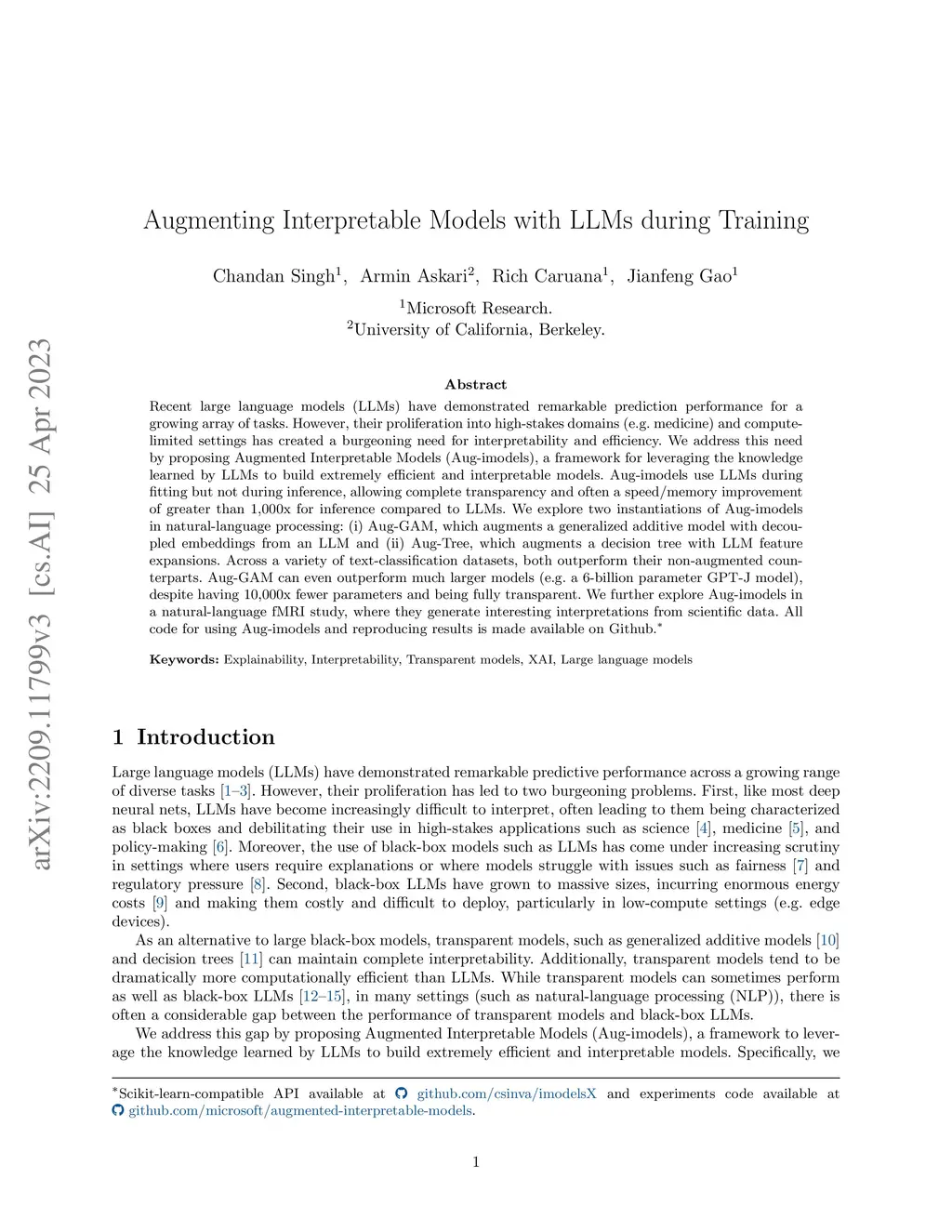 Recent large language models (LLMs) have demonstrated remarkable prediction performance for a growing array of tasks. However, their proliferation into high-stakes domains (e.g. medicine) and compute-limited settings has created a burgeoning need for interpretability and efficiency. We address this need by proposing Augmented Interpretable Models (Aug-imodels), a framework for leveraging the knowledge learned by LLMs to build extremely efficient and interpretable models. Aug-imodels use LLMs during fitting but not during inference, allowing complete transparency and often a speed/memory improvement of greater than 1,000x for inference compared to LLMs. We explore two instantiations of Aug-imodels in natural-language processing: (i) Aug-GAM, which augments a generalized additive model with decoupled embeddings from an LLM and (ii) Aug-Tree, which augments a decision tree with LLM feature expansions. Across a variety of text-classification datasets, both outperform their non-augmented counterparts. Aug-GAM can even outperform much larger models (e.g. a 6-billion parameter GPT-J model), despite having 10,000x fewer parameters and being fully transparent. We further explore Aug-imodels in a natural-language fMRI study, where they generate interesting interpretations from scientific data. All code for using Aug-imodels and reproducing results is made available on Github.