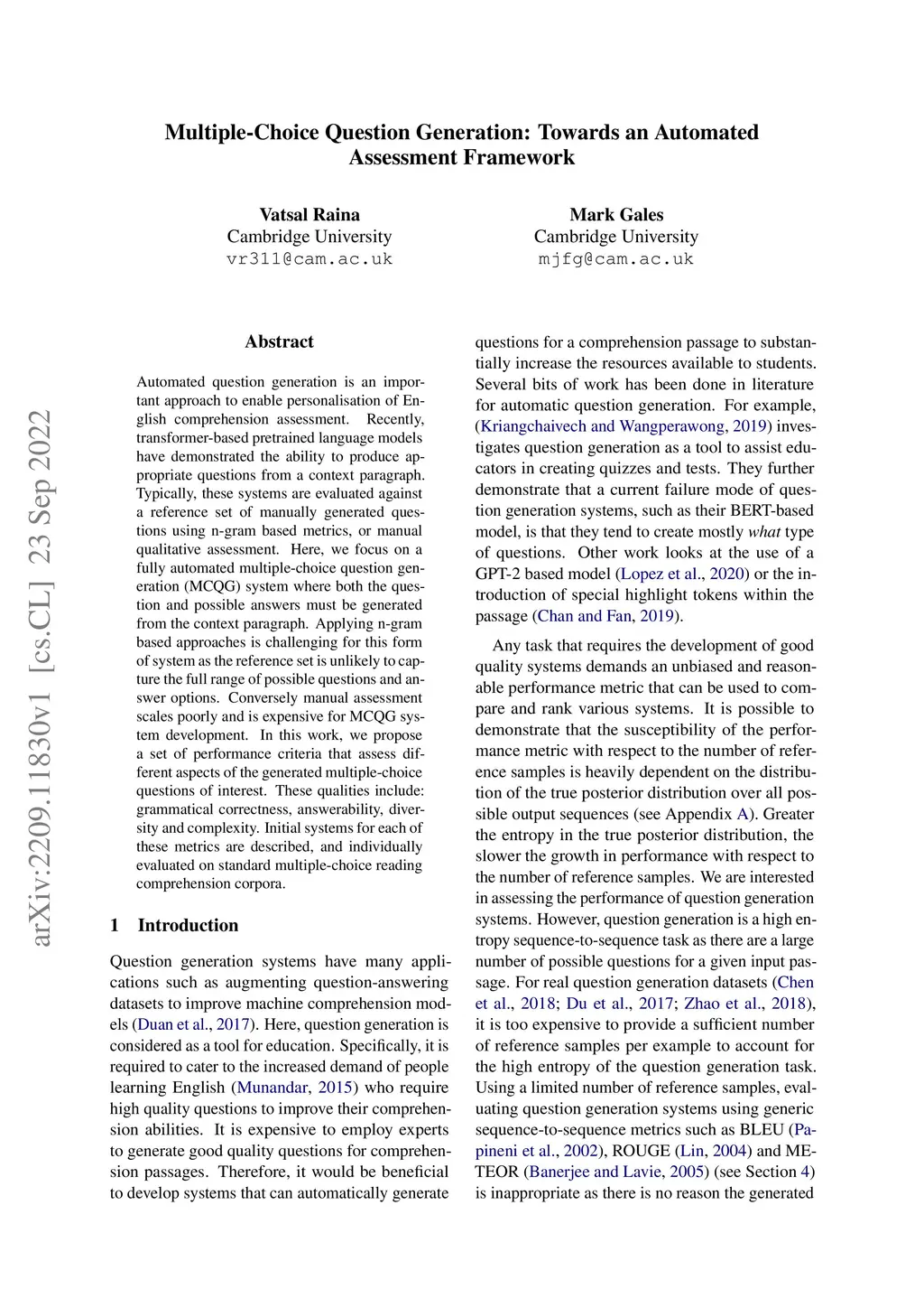 Multiple-Choice Question Generation: Towards an Automated Assessment