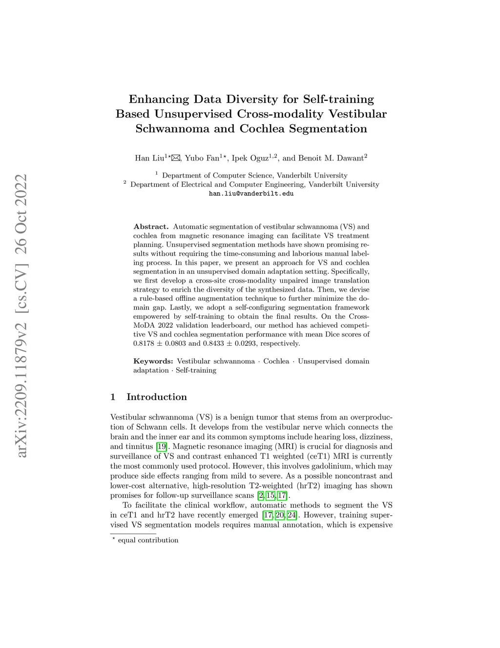 Automatic segmentation of vestibular schwannoma (VS) and cochlea from magnetic resonance imaging can facilitate VS treatment planning. Unsupervised segmentation methods have shown promising results without requiring the time-consuming and laborious manual labeling process. In this paper, we present an approach for VS and cochlea segmentation in an unsupervised domain adaptation setting. Specifically, we first develop a cross-site cross-modality unpaired image translation strategy to enrich the diversity of the synthesized data. Then, we devise a rule-based offline augmentation technique to further minimize the domain gap. Lastly, we adopt a self-configuring segmentation framework empowered by self-training to obtain the final results. On the CrossMoDA 2022 validation leaderboard, our method has achieved competitive VS and cochlea segmentation performance with mean Dice scores of 0.8178 0.0803 and 0.8433 0.0293, respectively.