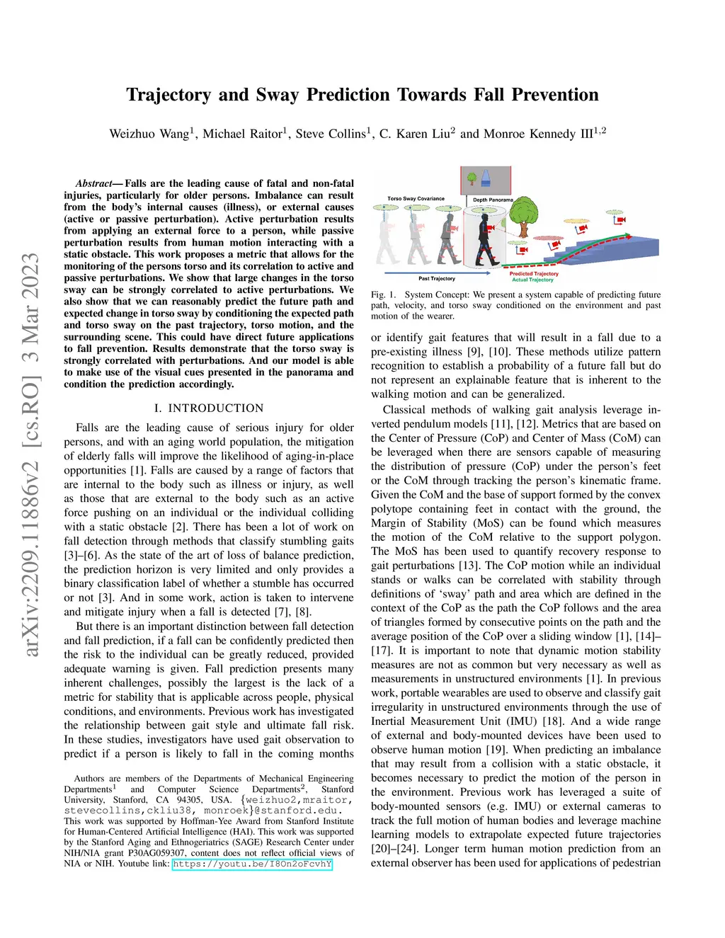 Falls are the leading cause of fatal and non-fatal injuries, particularly for older persons. Imbalance can result from the body's internal causes (illness), or external causes (active or passive perturbation). Active perturbation results from applying an external force to a person, while passive perturbation results from human motion interacting with a static obstacle. This work proposes a metric that allows for the monitoring of the person's torso and its correlation to active and passive perturbations. We show that large changes in the torso sway can be strongly correlated to active perturbations. We also show that we can reasonably predict the future path and expected change in torso sway by conditioning the expected path and torso sway on the past trajectory, torso motion, and the surrounding scene. This could have direct future applications to fall prevention. Results demonstrate that the torso sway is strongly correlated with perturbations. And our model is able to make use of the visual cues presented in the panorama and condition the prediction accordingly.