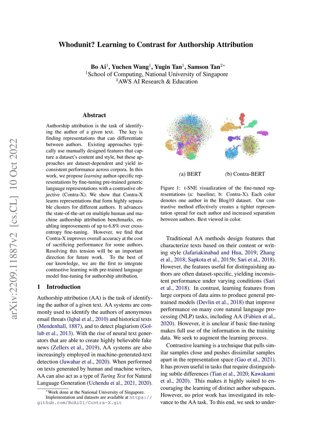 Authorship attribution is the task of identifying the author of a given text. The key is finding representations that can differentiate between authors. Existing approaches typically use manually designed features that capture a dataset's content and style, but these approaches are dataset-dependent and yield inconsistent performance across corpora. In this work, we propose \textit{learning} author-specific representations by fine-tuning pre-trained generic language representations with a contrastive objective (Contra-X). We show that Contra-X learns representations that form highly separable clusters for different authors. It advances the state-of-the-art on multiple human and machine authorship attribution benchmarks, enabling improvements of up to 6.8% over cross-entropy fine-tuning. However, we find that Contra-X improves overall accuracy at the cost of sacrificing performance for some authors. Resolving this tension will be an important direction for future work. To the best of our knowledge, we are the first to integrate contrastive learning with pre-trained language model fine-tuning for authorship attribution.