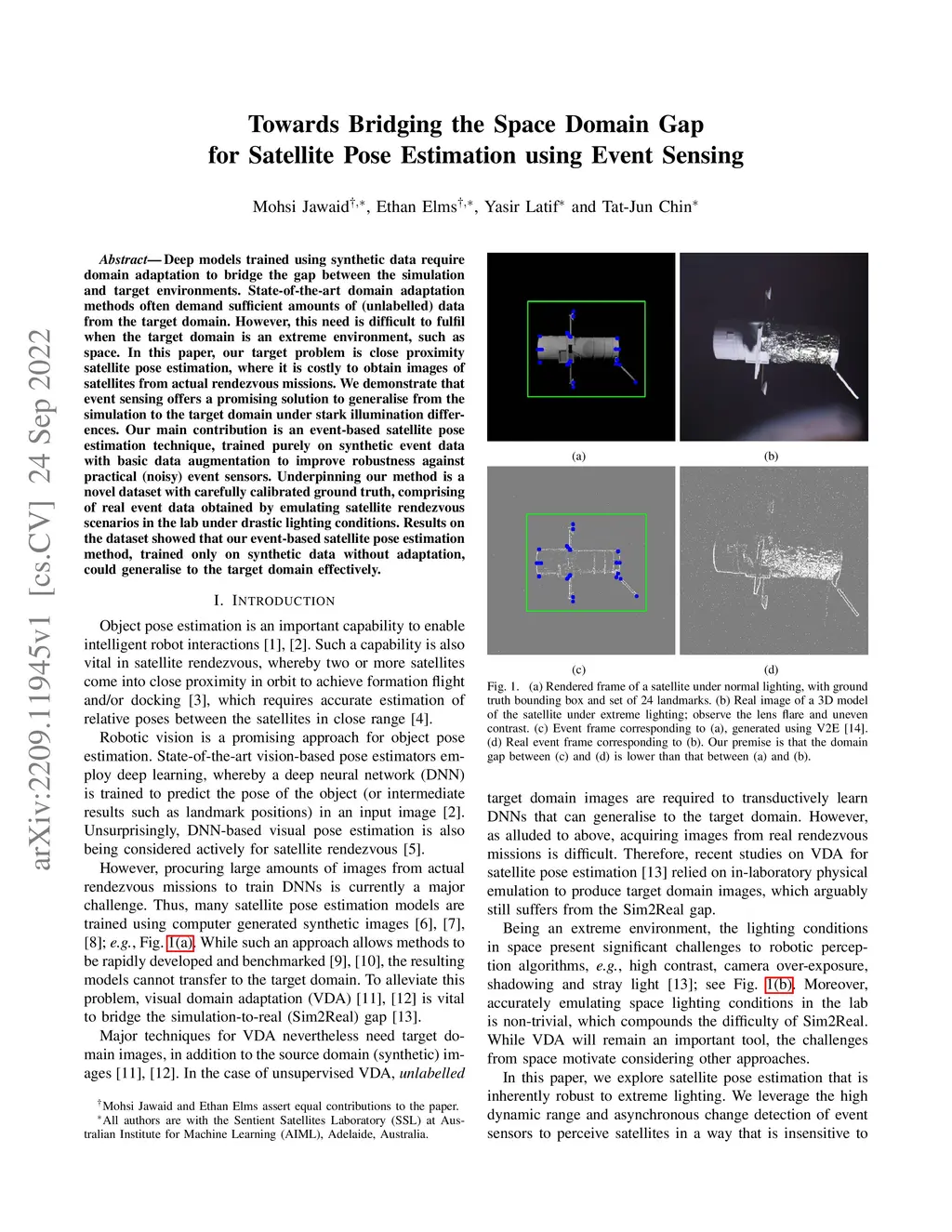 Deep models trained using synthetic data require domain adaptation to bridge the gap between the simulation and target environments. State-of-the-art domain adaptation methods often demand sufficient amounts of (unlabelled) data from the target domain. However, this need is difficult to fulfil when the target domain is an extreme environment, such as space. In this paper, our target problem is close proximity satellite pose estimation, where it is costly to obtain images of satellites from actual rendezvous missions. We demonstrate that event sensing offers a promising solution to generalise from the simulation to the target domain under stark illumination differences. Our main contribution is an event-based satellite pose estimation technique, trained purely on synthetic event data with basic data augmentation to improve robustness against practical (noisy) event sensors. Underpinning our method is a novel dataset with carefully calibrated ground truth, comprising of real event data obtained by emulating satellite rendezvous scenarios in the lab under drastic lighting conditions. Results on the dataset showed that our event-based satellite pose estimation method, trained only on synthetic data without adaptation, could generalise to the target domain effectively.