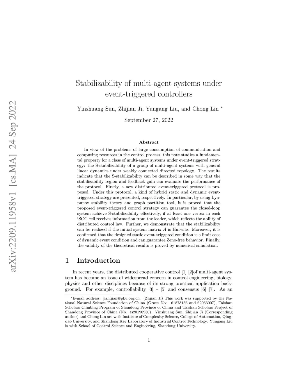 In view of the problems of large consumption of communication and computing resources in the control process, this note studies a fundamental property for a class of multi-agent systems under event-triggered strategy: the S-stabilizability of a group of multi-agent systems with general linear dynamics under weakly connected directed topology. The results indicate that the S-stabilizability can be described in some way that the stabilizability region and feedback gain can evaluate the performance of the protocol. Firstly, a new distributed event-triggered protocol is proposed. Under this protocol, a kind of hybrid static and dynamic event-triggered strategy are presented, respectively. In particular, by using Lyapunov stability theory and graph partition tool, it is proved that the proposed event-triggered control strategy can guarantee the closed-loop system achieve S-stabilizability effectively, if at least one vertex in each iSCC cell receives information from the leader, which reflects the ability of distributed control law. Further, we demonstrate that the stabilizability can be realized if the initial system matrix A is Hurwitz. Moreover, it is confirmed that the designed static event-triggered condition is a limit case of dynamic event condition and can guarantee Zeno-free behavior. Finally, the validity of the theoretical results is proved by numerical simulation.