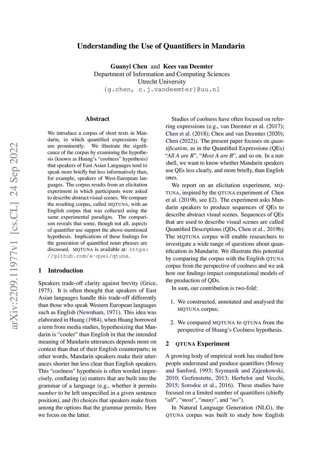 We introduce a corpus of short texts in Mandarin, in which quantified expressions figure prominently. We illustrate the significance of the corpus by examining the hypothesis (known as Huang's "coolness" hypothesis) that speakers of East Asian Languages tend to speak more briefly but less informatively than, for example, speakers of West-European languages. The corpus results from an elicitation experiment in which participants were asked to describe abstract visual scenes. We compare the resulting corpus, called MQTUNA, with an English corpus that was collected using the same experimental paradigm. The comparison reveals that some, though not all, aspects of quantifier use support the above-mentioned hypothesis. Implications of these findings for the generation of quantified noun phrases are discussed.