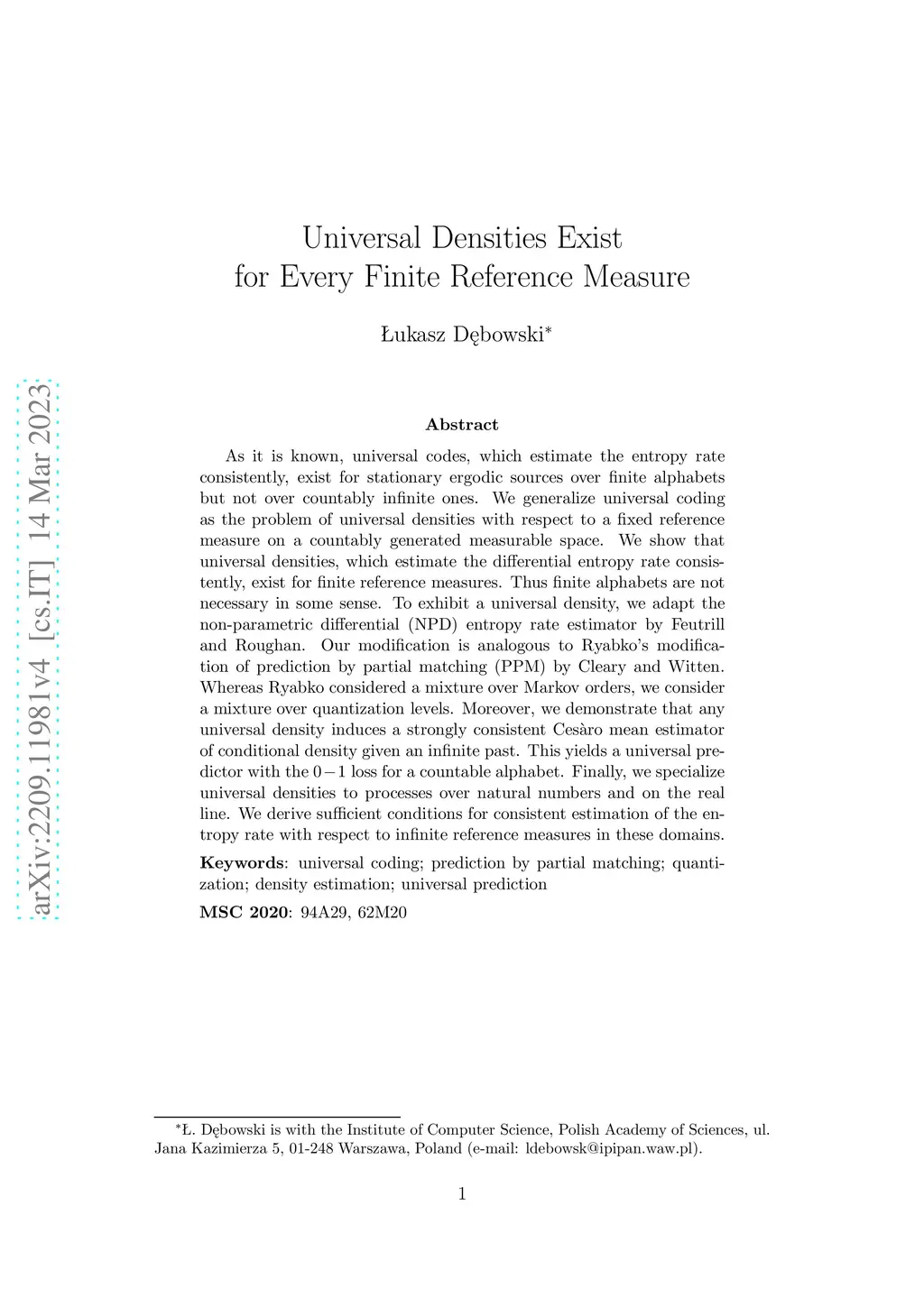 As it is known, universal codes, which estimate the entropy rate consistently, exist for stationary ergodic sources over finite alphabets but not over countably infinite ones. We generalize universal coding as the problem of universal densities with respect to a fixed reference measure on a countably generated measurable space. We show that universal densities, which estimate the differential entropy rate consistently, exist for finite reference measures. Thus finite alphabets are not necessary in some sense. To exhibit a universal density, we adapt the non-parametric differential (NPD) entropy rate estimator by Feutrill and Roughan. Our modification is analogous to Ryabko's modification of prediction by partial matching (PPM) by Cleary and Witten. Whereas Ryabko considered a mixture over Markov orders, we consider a mixture over quantization levels. Moreover, we demonstrate that any universal density induces a strongly consistent Ces\`aro mean estimator of conditional density given an infinite past. This yields a universal predictor with the loss for a countable alphabet. Finally, we specialize universal densities to processes over natural numbers and on the real line. We derive sufficient conditions for consistent estimation of the entropy rate with respect to infinite reference measures in these domains.