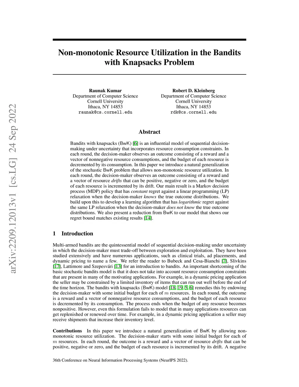 Bandits with knapsacks (BwK) is an influential model of sequential decision-making under uncertainty that incorporates resource consumption constraints. In each round, the decision-maker observes an outcome consisting of a reward and a vector of nonnegative resource consumptions, and the budget of each resource is decremented by its consumption. In this paper we introduce a natural generalization of the stochastic BwK problem that allows non-monotonic resource utilization. In each round, the decision-maker observes an outcome consisting of a reward and a vector of resource drifts that can be positive, negative or zero, and the budget of each resource is incremented by its drift. Our main result is a Markov decision process (MDP) policy that has constant regret against a linear programming (LP) relaxation when the decision-maker knows the true outcome distributions. We build upon this to develop a learning algorithm that has logarithmic regret against the same LP relaxation when the decision-maker does not know the true outcome distributions. We also present a reduction from BwK to our model that shows our regret bound matches existing results.