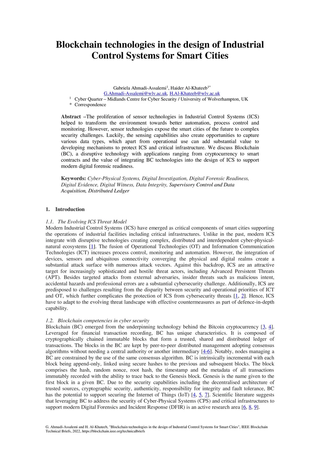 The proliferation of sensor technologies in Industrial Control Systems (ICS) helped to transform the environment towards better automation, process control and monitoring. However, sensor technologies expose the smart cities of the future to complex security challenges. Luckily, the sensing capabilities also create opportunities to capture various data types, which apart from operational use can add substantial value to developing mechanisms to protect ICS and critical infrastructure. We discuss Blockchain (BC), a disruptive technology with applications ranging from cryptocurrency to smart contracts and the value of integrating BC technologies into the design of ICS to support modern digital forensic readiness.