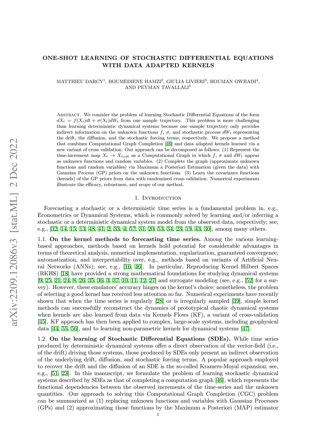 We consider the problem of learning Stochastic Differential Equations of the form $dX_t = f(X_t)dt+\sigma(X_t)dW_t $ from one sample trajectory. This problem is more challenging than learning deterministic dynamical systems because one sample trajectory only provides indirect information on the unknown functions , , and stochastic process representing the drift, the diffusion, and the stochastic forcing terms, respectively. We propose a method that combines Computational Graph Completion and data adapted kernels learned via a new variant of cross validation. Our approach can be decomposed as follows: (1) Represent the time-increment map as a Computational Graph in which , and appear as unknown functions and random variables. (2) Complete the graph (approximate unknown functions and random variables) via Maximum a Posteriori Estimation (given the data) with Gaussian Process (GP) priors on the unknown functions. (3) Learn the covariance functions (kernels) of the GP priors from data with randomized cross-validation. Numerical experiments illustrate the efficacy, robustness, and scope of our method.
