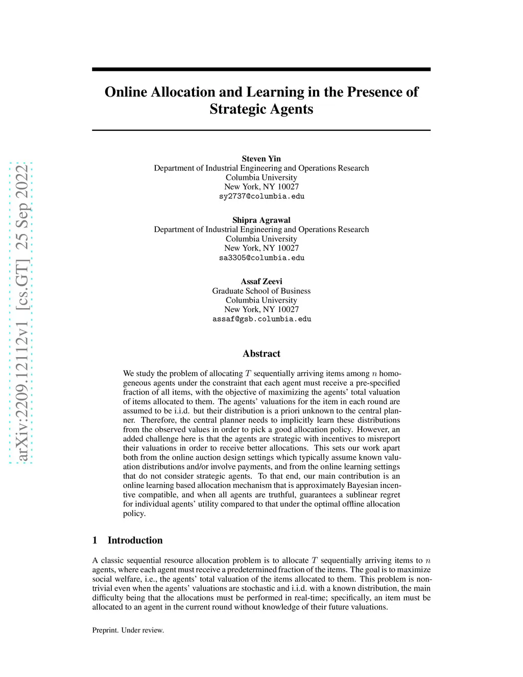 We study the problem of allocating sequentially arriving items among homogeneous agents under the constraint that each agent must receive a pre-specified fraction of all items, with the objective of maximizing the agents' total valuation of items allocated to them. The agents' valuations for the item in each round are assumed to be i.i.d. but their distribution is a priori unknown to the central planner. Therefore, the central planner needs to implicitly learn these distributions from the observed values in order to pick a good allocation policy. However, an added challenge here is that the agents are strategic with incentives to misreport their valuations in order to receive better allocations. This sets our work apart both from the online auction design settings which typically assume known valuation distributions and/or involve payments, and from the online learning settings that do not consider strategic agents. To that end, our main contribution is an online learning based allocation mechanism that is approximately Bayesian incentive compatible, and when all agents are truthful, guarantees a sublinear regret for individual agents' utility compared to that under the optimal offline allocation policy.
