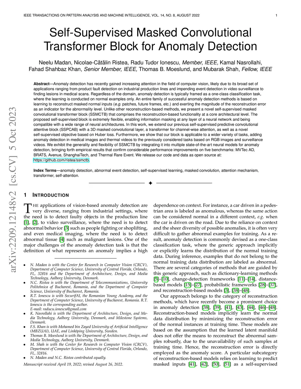 Self-Supervised Masked Convolutional Transformer Block for Anomaly